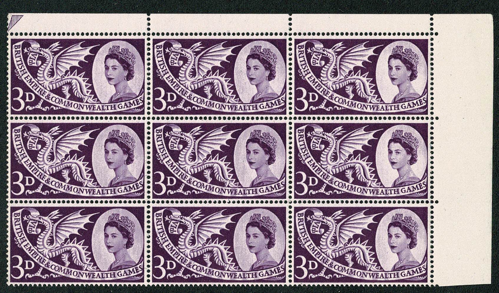 UM positional block óf nine with "white flaw on fin of dragon's tail" R 3/4.