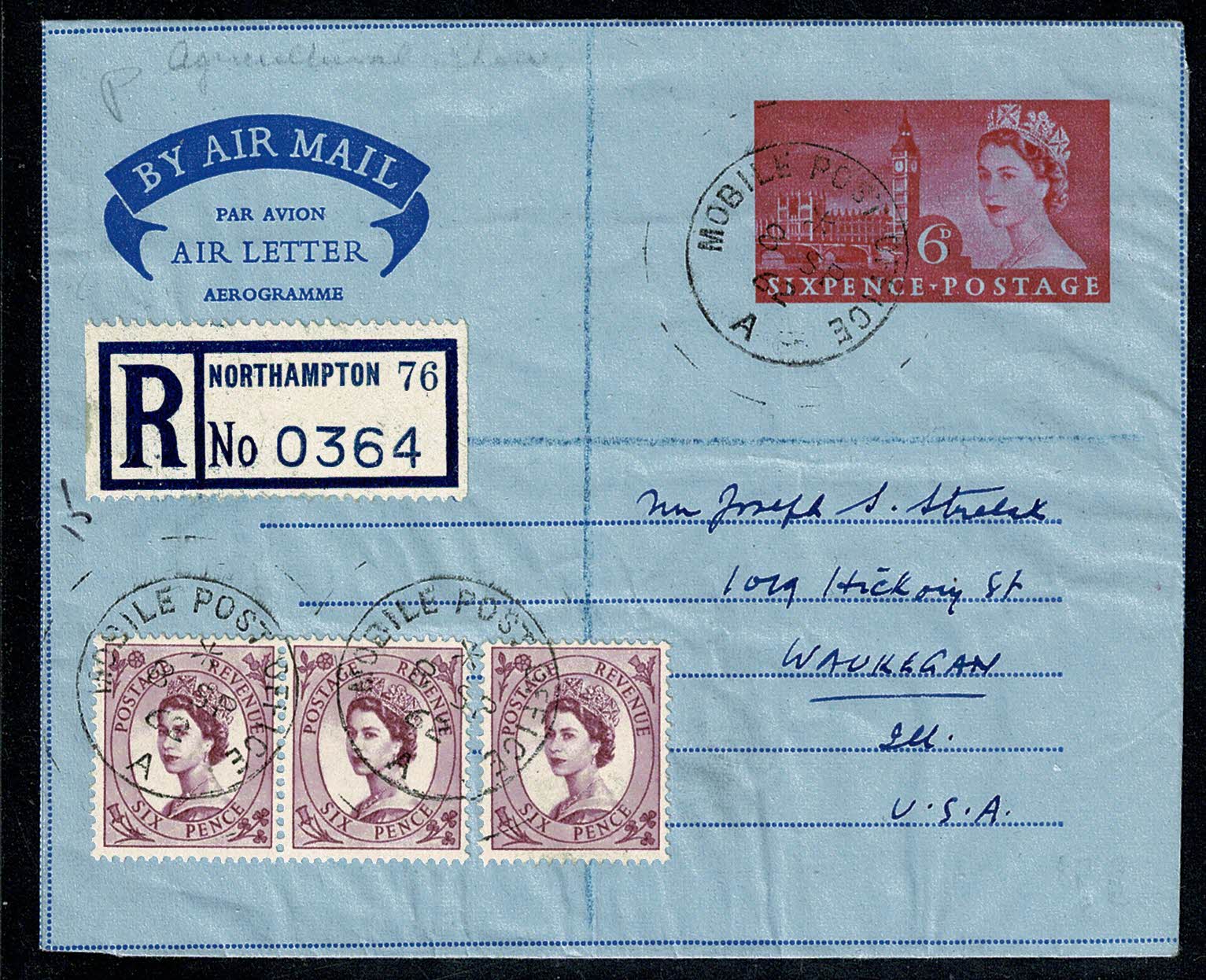 6d Parliament Airletter upgraded with 3 x 6d Wilding definitives. Mobile Post Office cancel from Northampton to Waukegan, Illinois (suburb of Chicago), with certificate of posting.