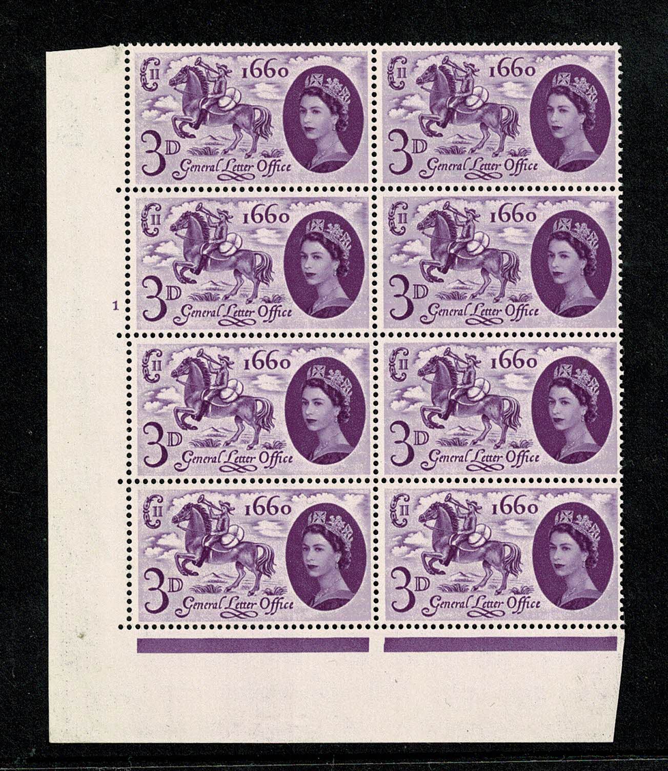 Cylinder block of eiight, all stamps unmounted mint, mounted in margin. 1960 General Letter Office 3d. Listed variety "broken mane" R 17/2. As illustrated