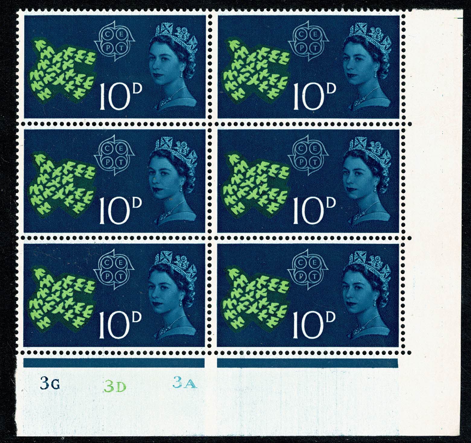 1961 C.E.P.T. 10d Cylinder 3G 3D 3A no dot block of six. SG 628