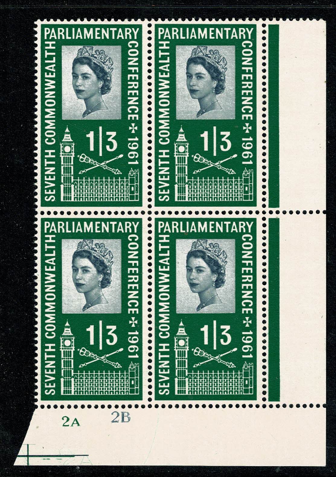 1961 Parliament 1/3 Cylinder 2A 2B Perf Type B block of four. SG 630