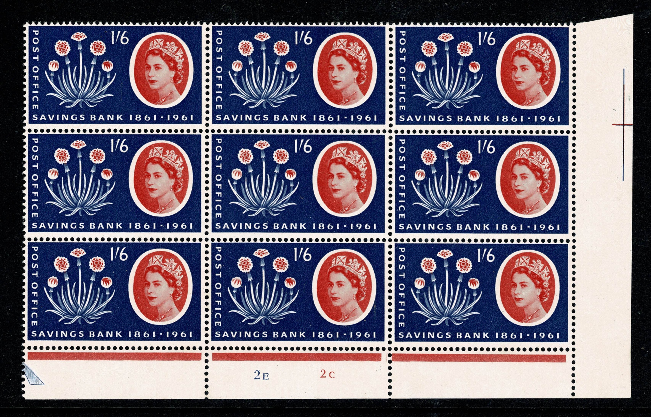 1961 P.O.S.B 1/6. Cylinder 2E 2C Perf Type C (I/P) block of nine. SG 625A
