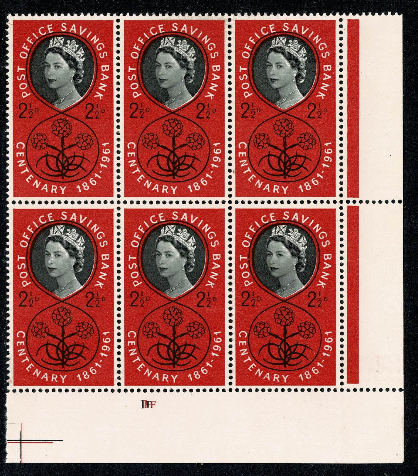 1961 P.O.S.B. 2½d Cylinder 1E 1F Perf Type B (P/I) block of six. SG 623A