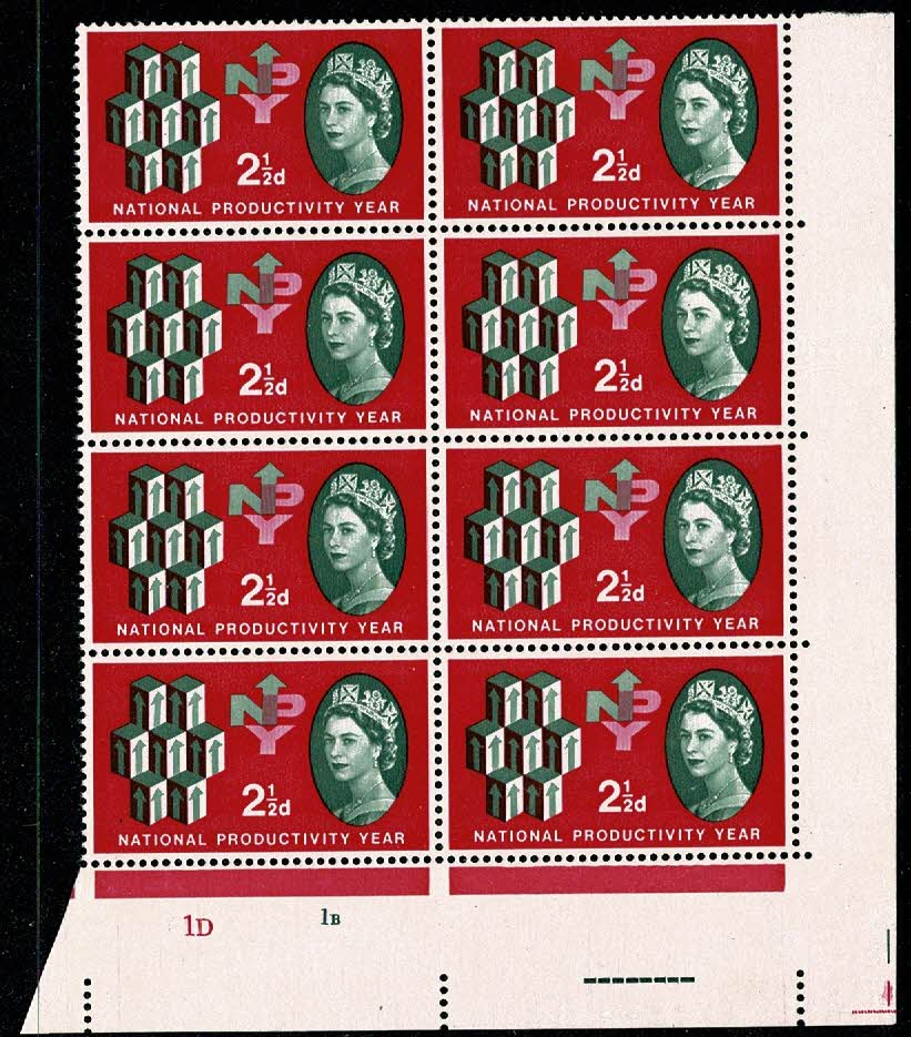 1962 NPY 2½d (ord). Cylinder 1D 1B no dot block of 8 with good constant variety.