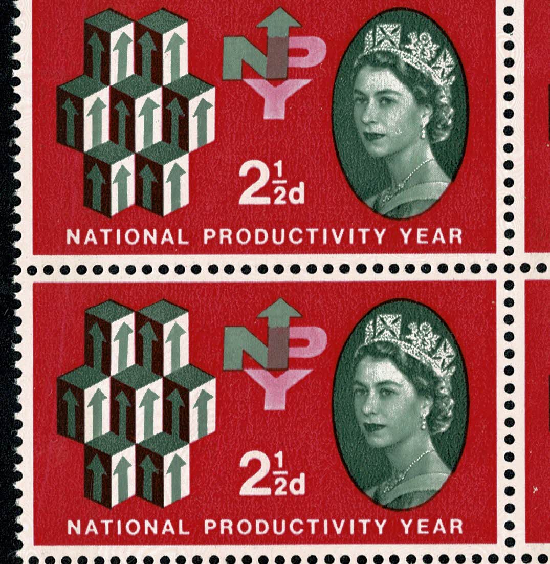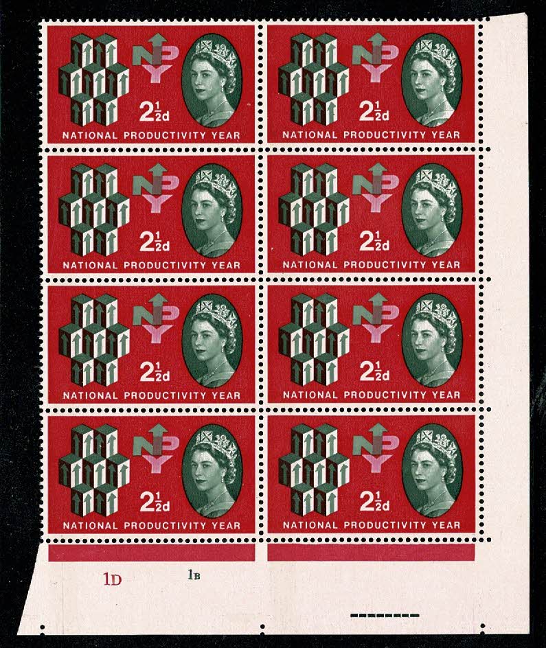 1962 NPY 2½d (phos). Cylinder block of 8 with good constant variety.