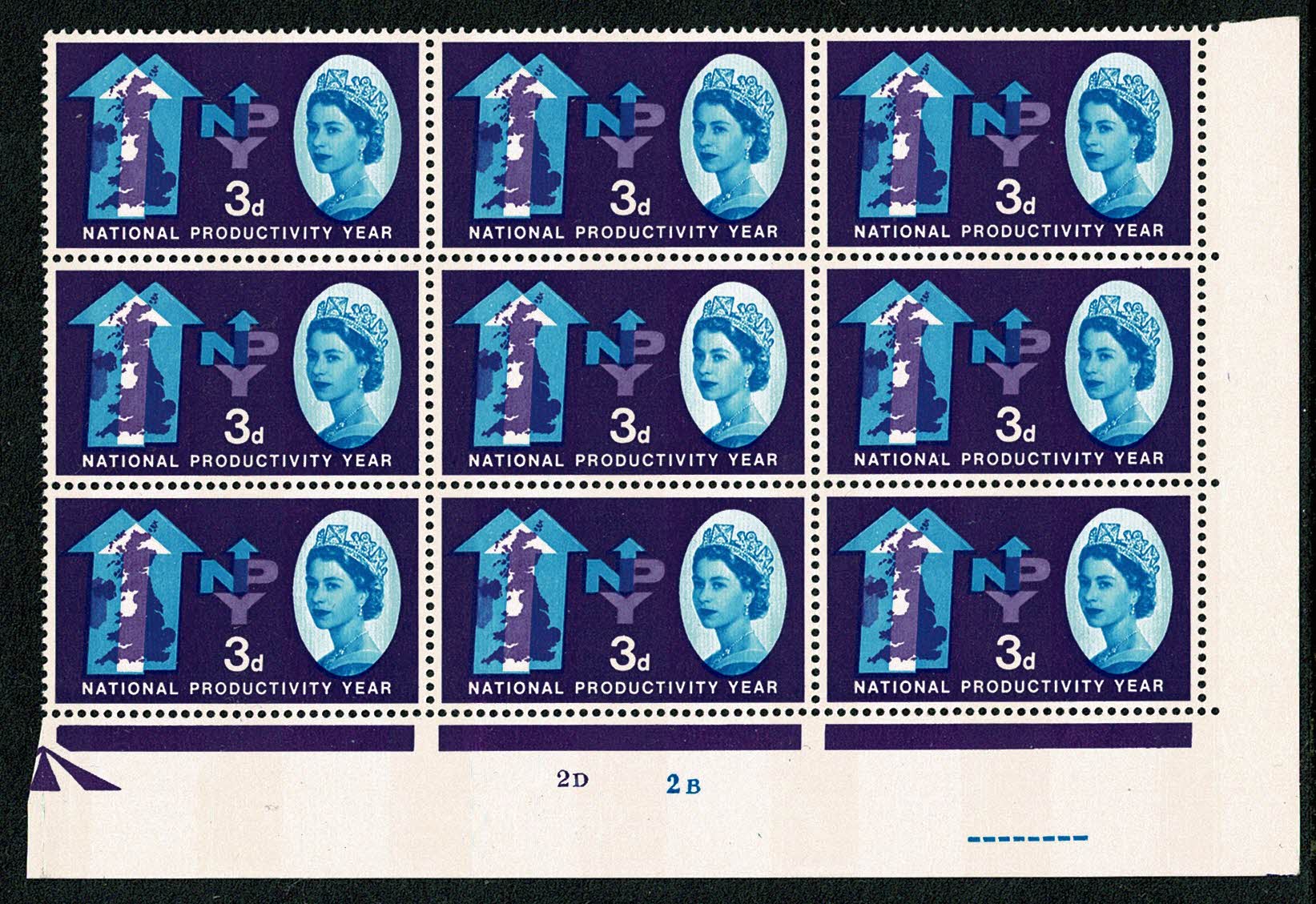 1962 NPY 3d (phos). Cyl. 2D 2B no dot block of nine.