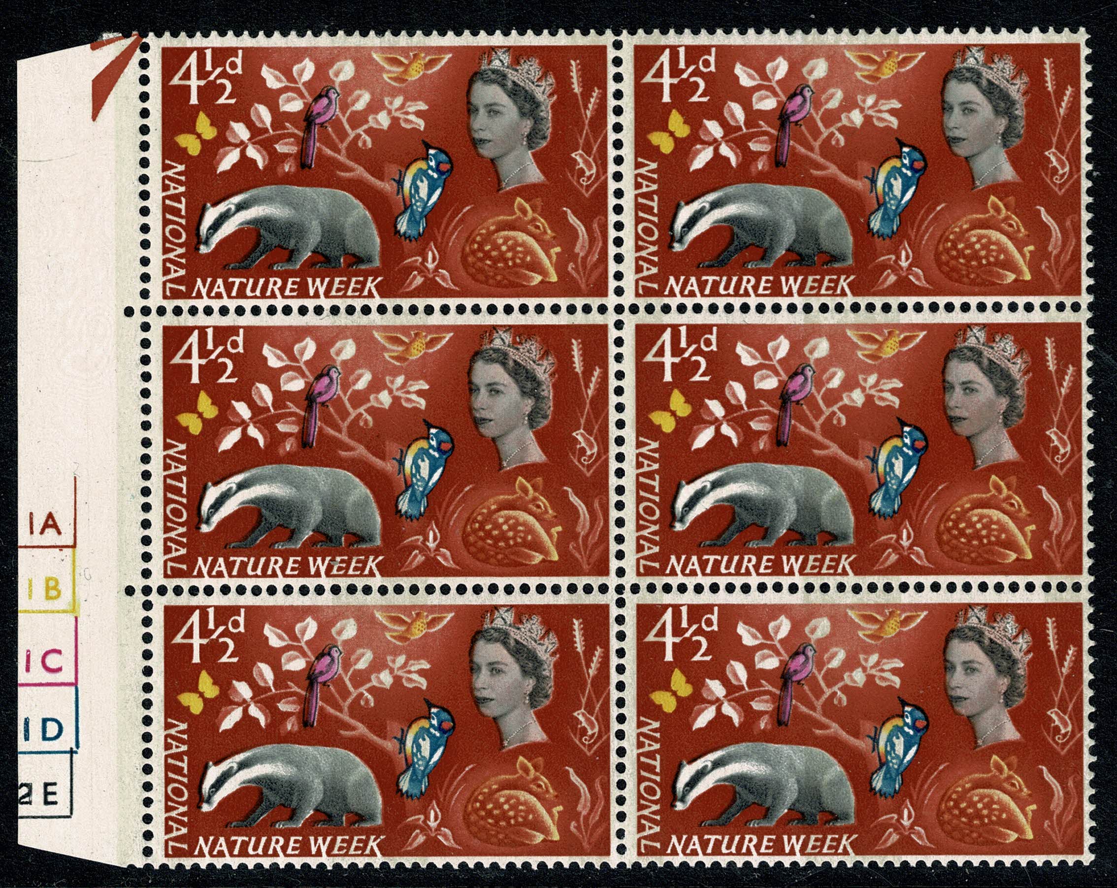 1963 Nature Week 4½d (phos). Row 12/13 Cyl. 1A 1B 1C 1D 2E block of six