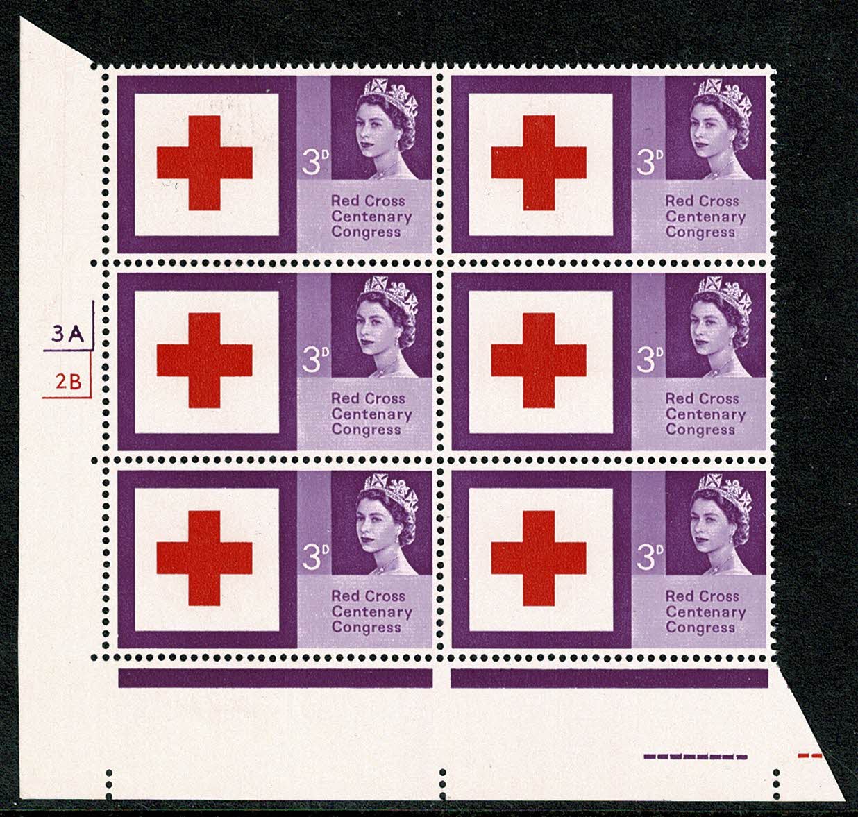 Unmounted mint 1963 Red Cross 3d (ord). Cyl. 3A 2B no dot block of six. Both margins angled.