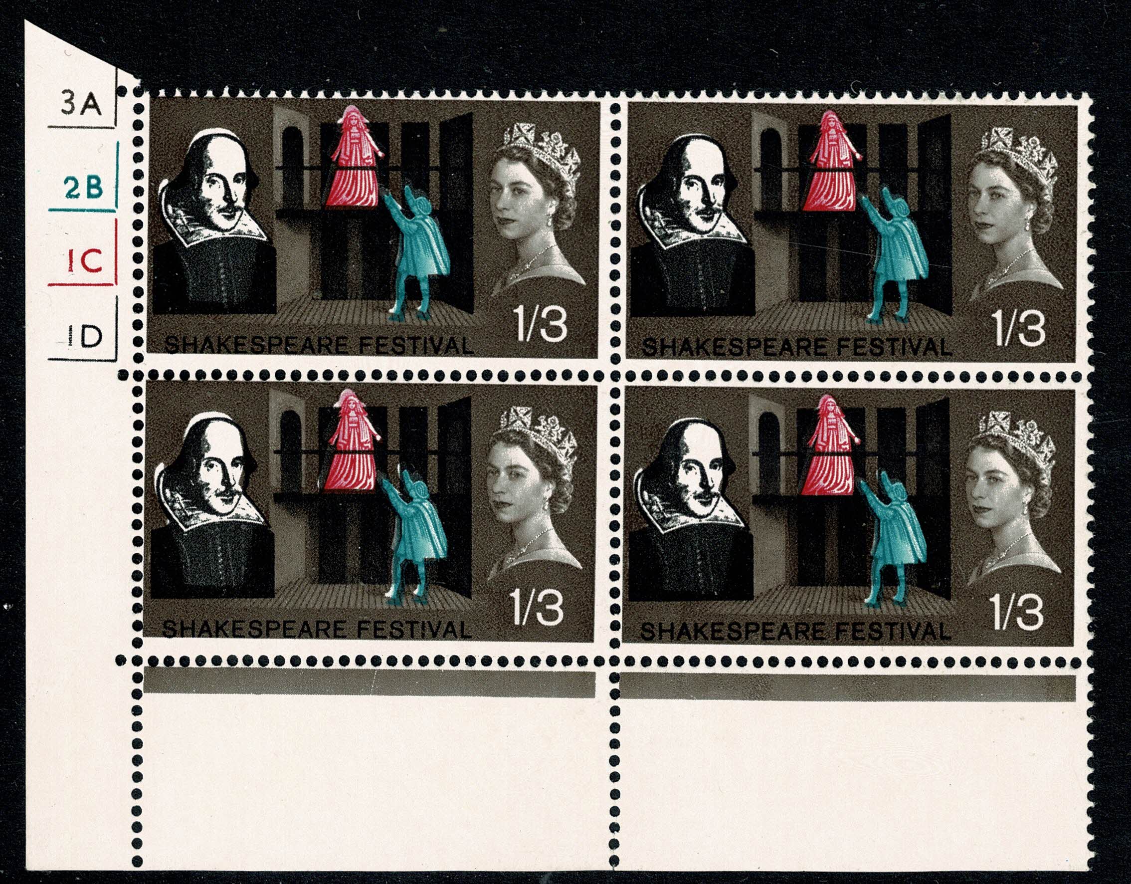 1964 Shakespeare 1/3 (ord). Cyl. 3A 2B 1C 1D no dot block of four. SG 648