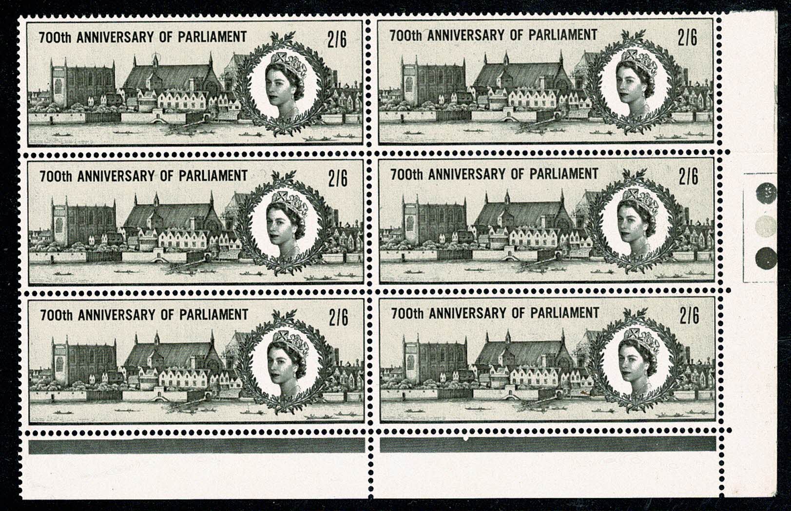 Unmounted mint 1965 700th Anniversary of Parliament 2/6. Traffic light block of six.