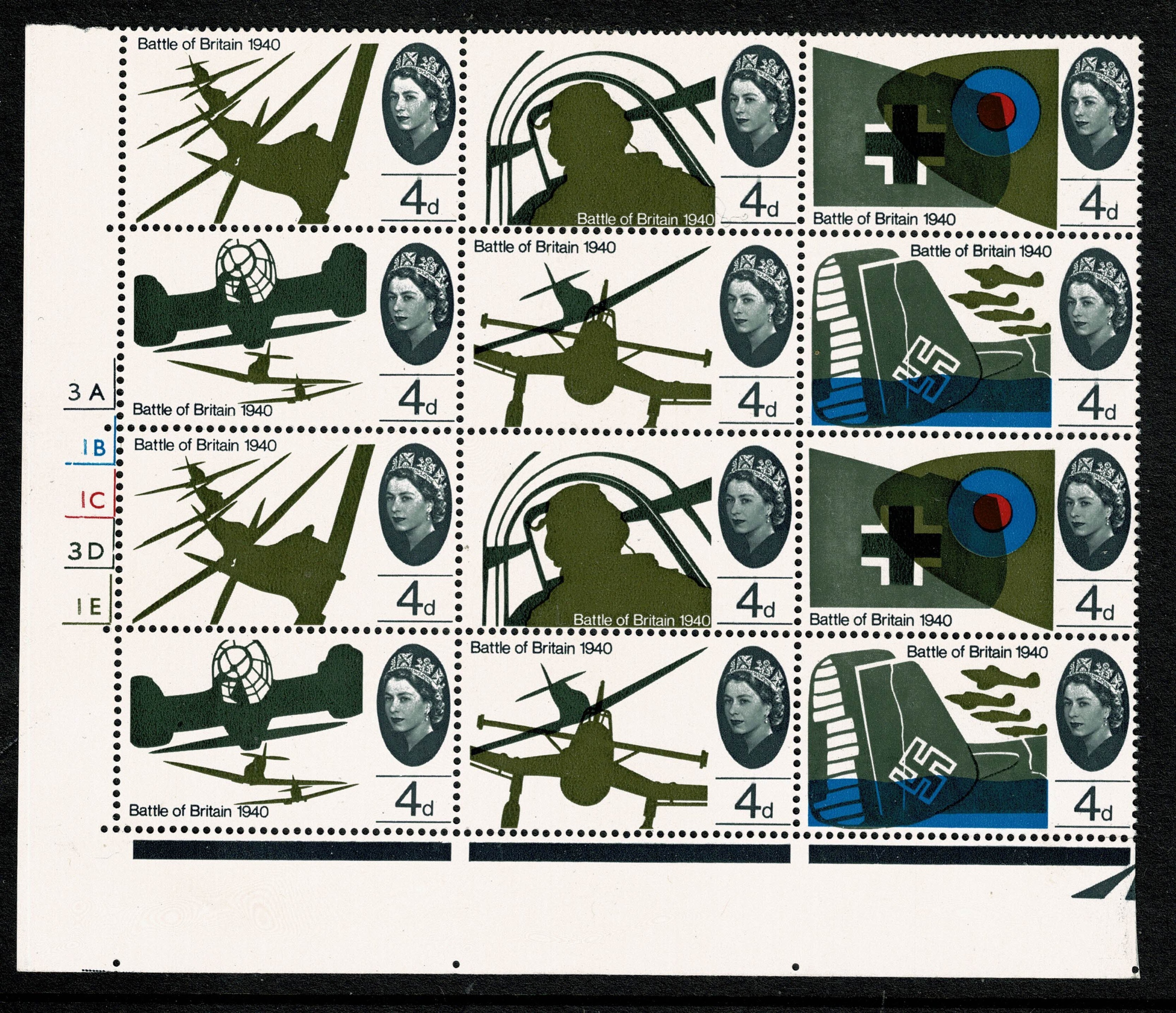 1965 Battle of Britain 4d (ord). Cylinder 3A 1B 1C 3D 1E no dot block of 12. SG 671-676.