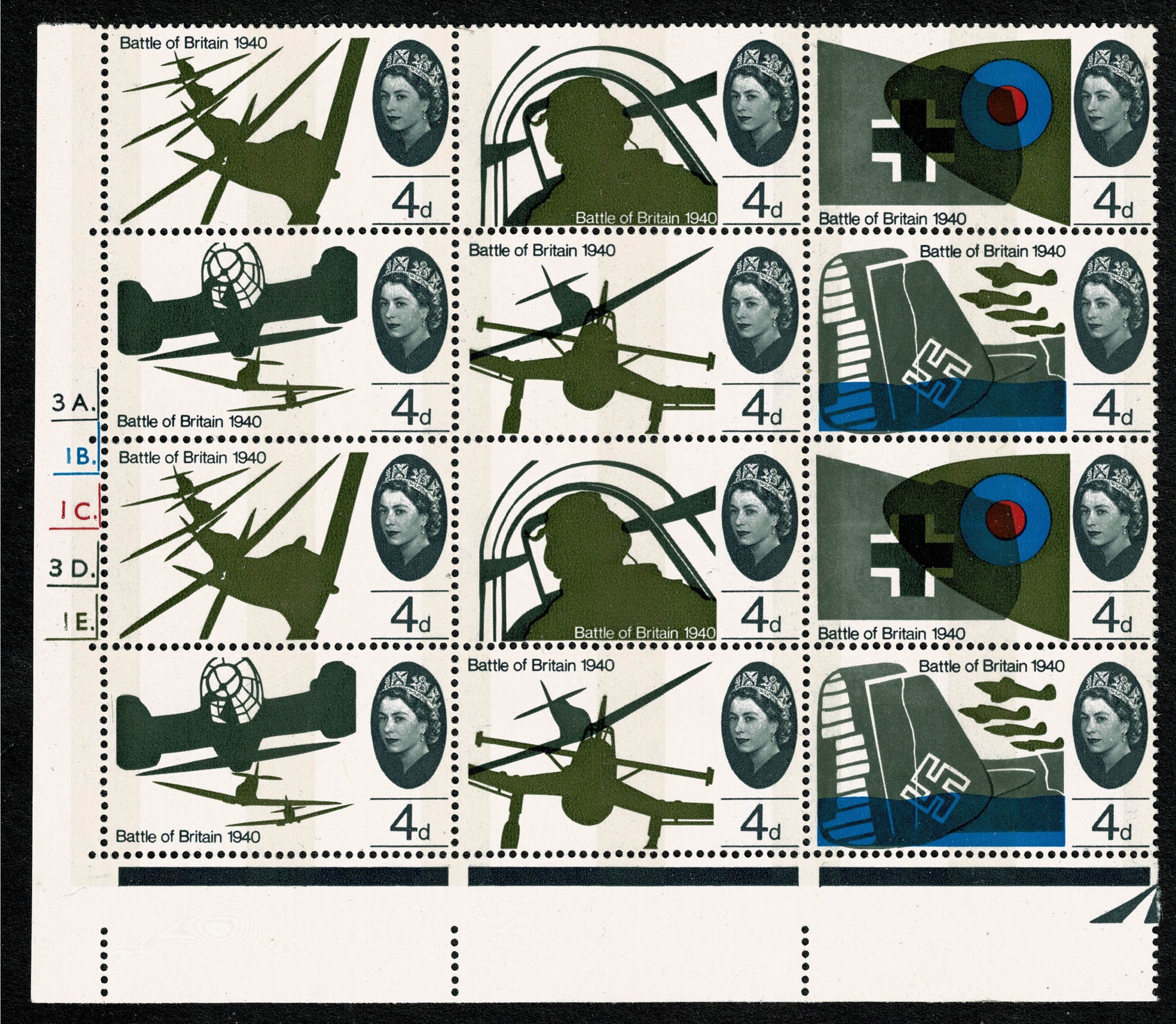 1965 Battle of Britain 4d (phos). Cylinder 3A 1B 1C 3D 1E dot block of 12. contains listed varieties.SG 671-676.