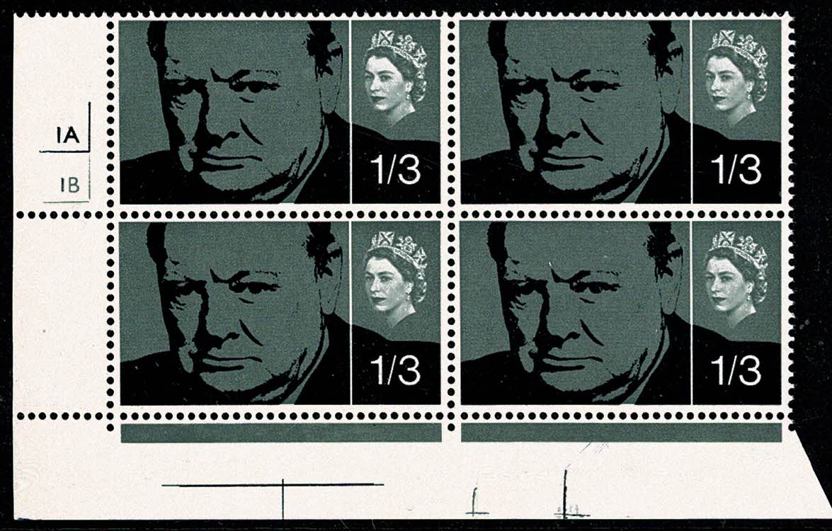 1965 Churchill 1/3 (ord). Cylinder 1A 1B no dot block of four.