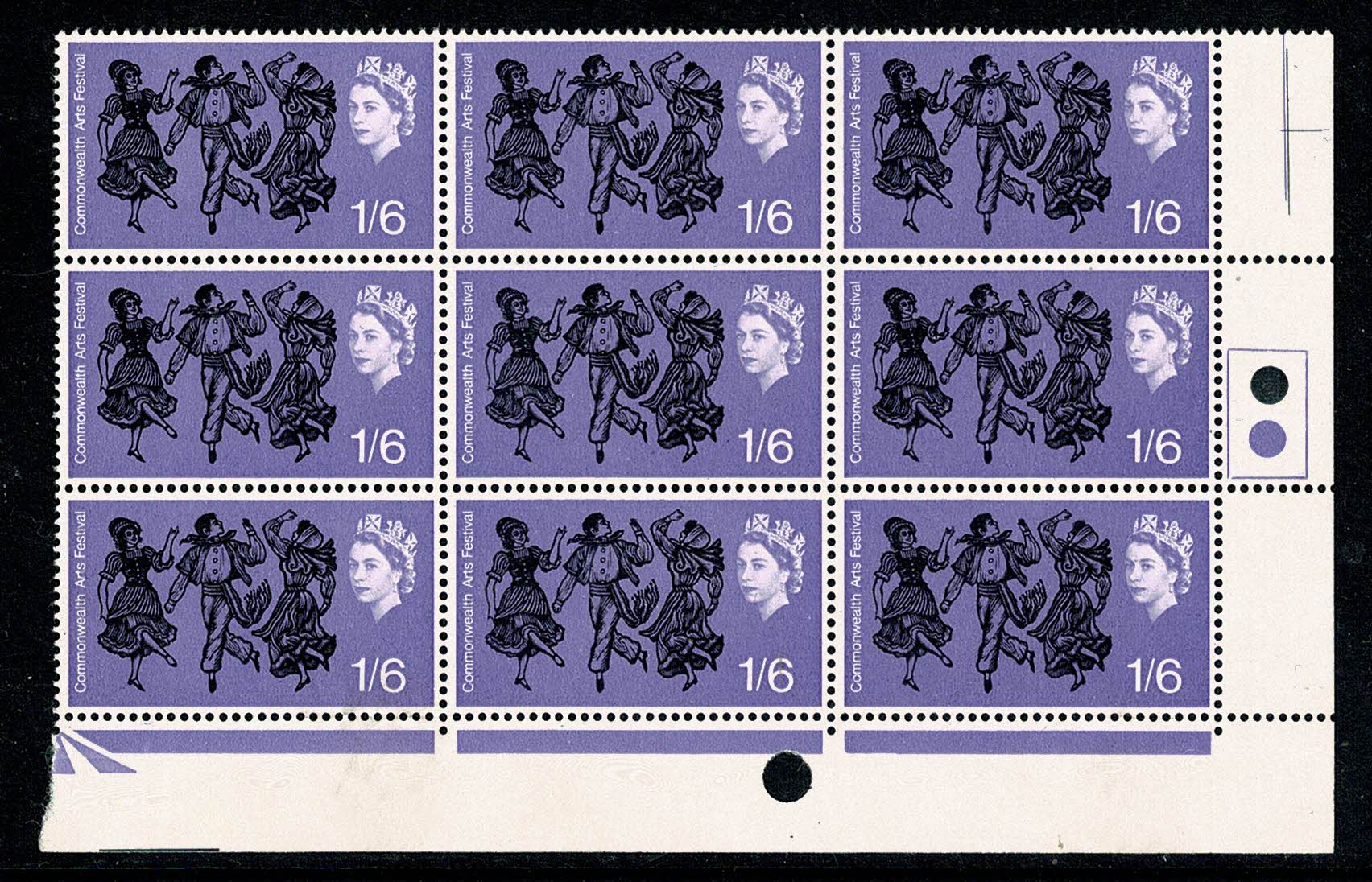 1965 Commonwealth Arts Festival 1/6 (ord). Listed variety in Traffic Light block of nine. SG 670