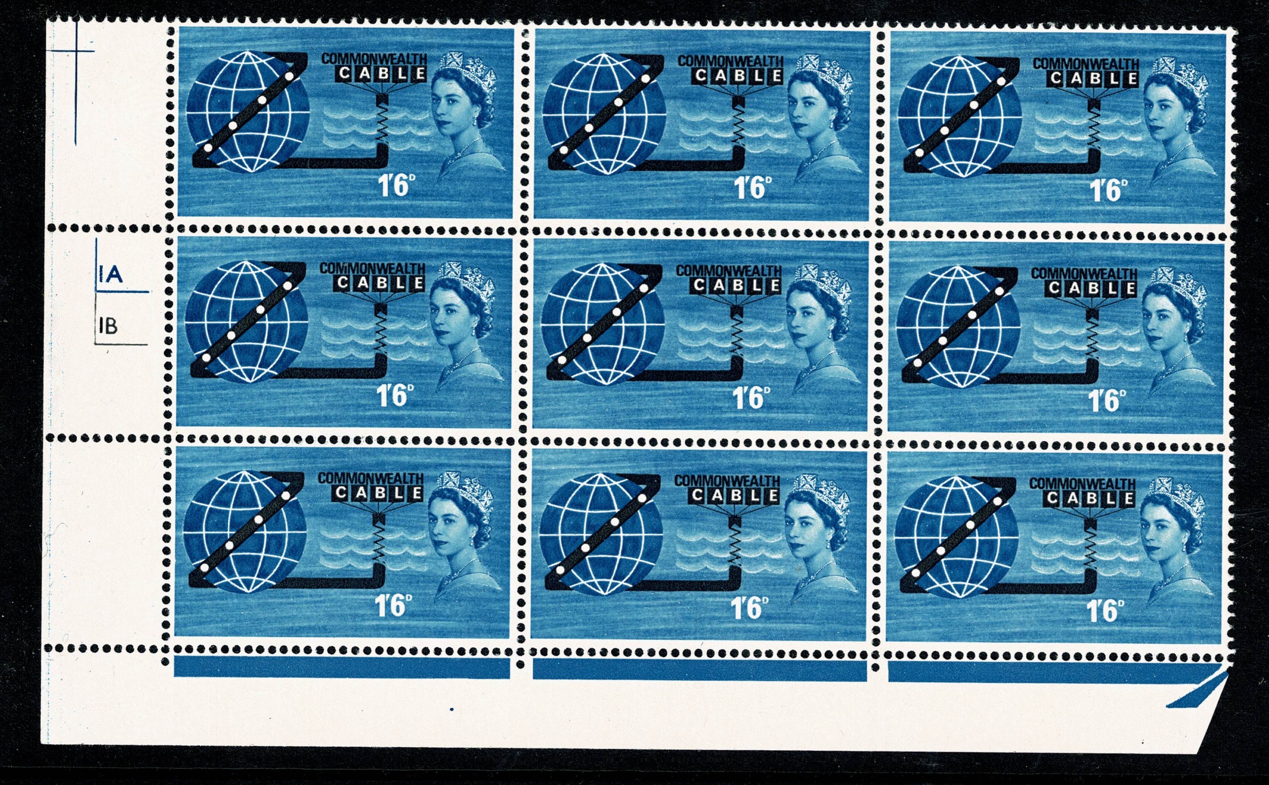 1965 COMPAC 1/6 (ord). Cylinder 1A 1B no dot block of nine. SG 645