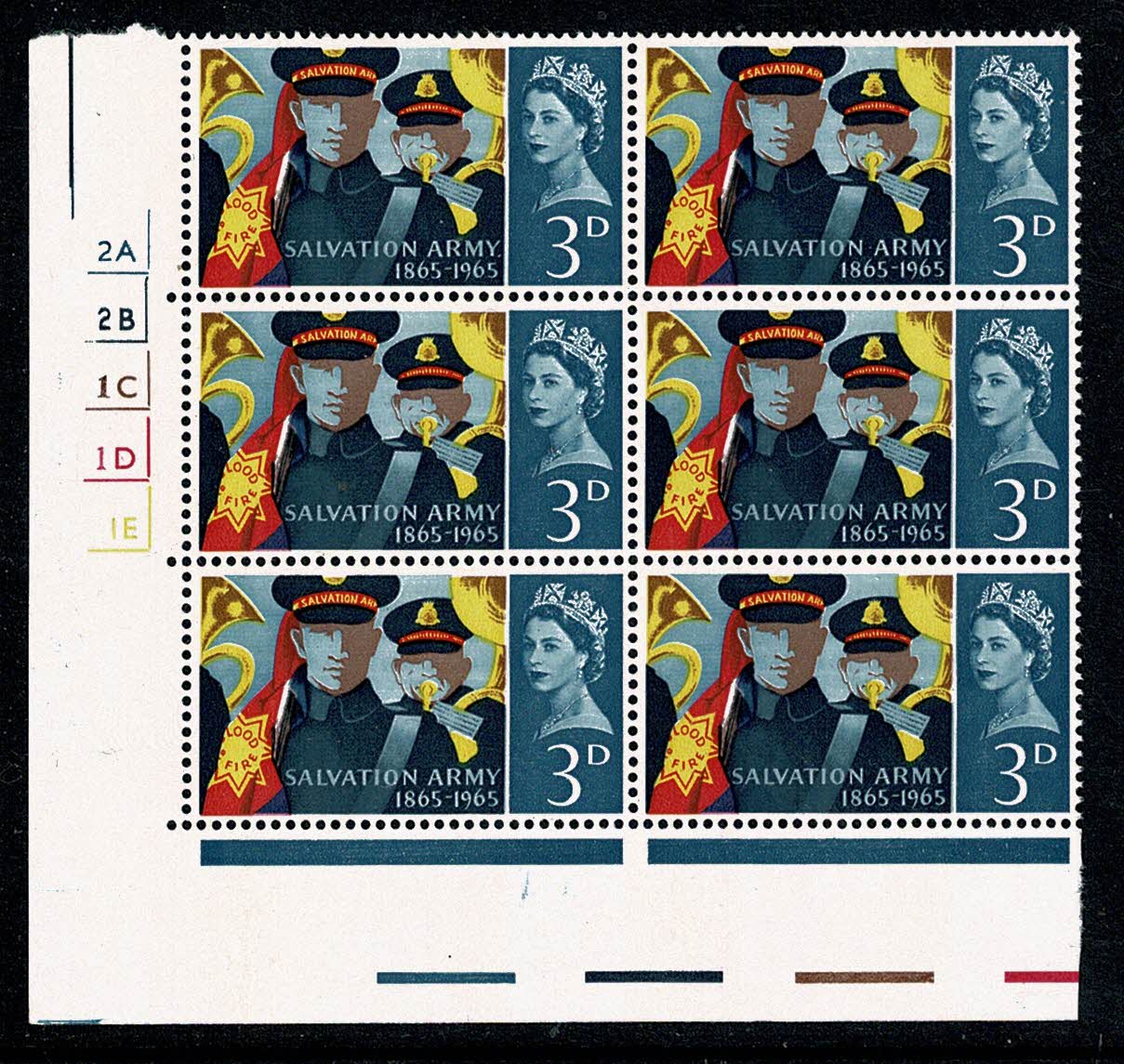 1965 Salvation Army 3d (ord). Cyl. 2A 2B 1C 1D 1E no dot block of six. SG 665
