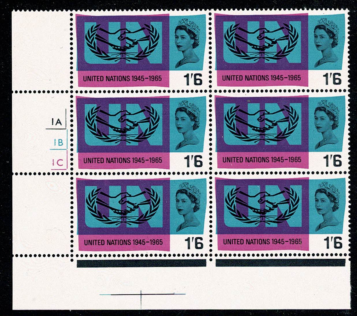 1965 United Nations 1/6 (ord). Cylinder 1A 1B 1C no dot block of six. SG 682