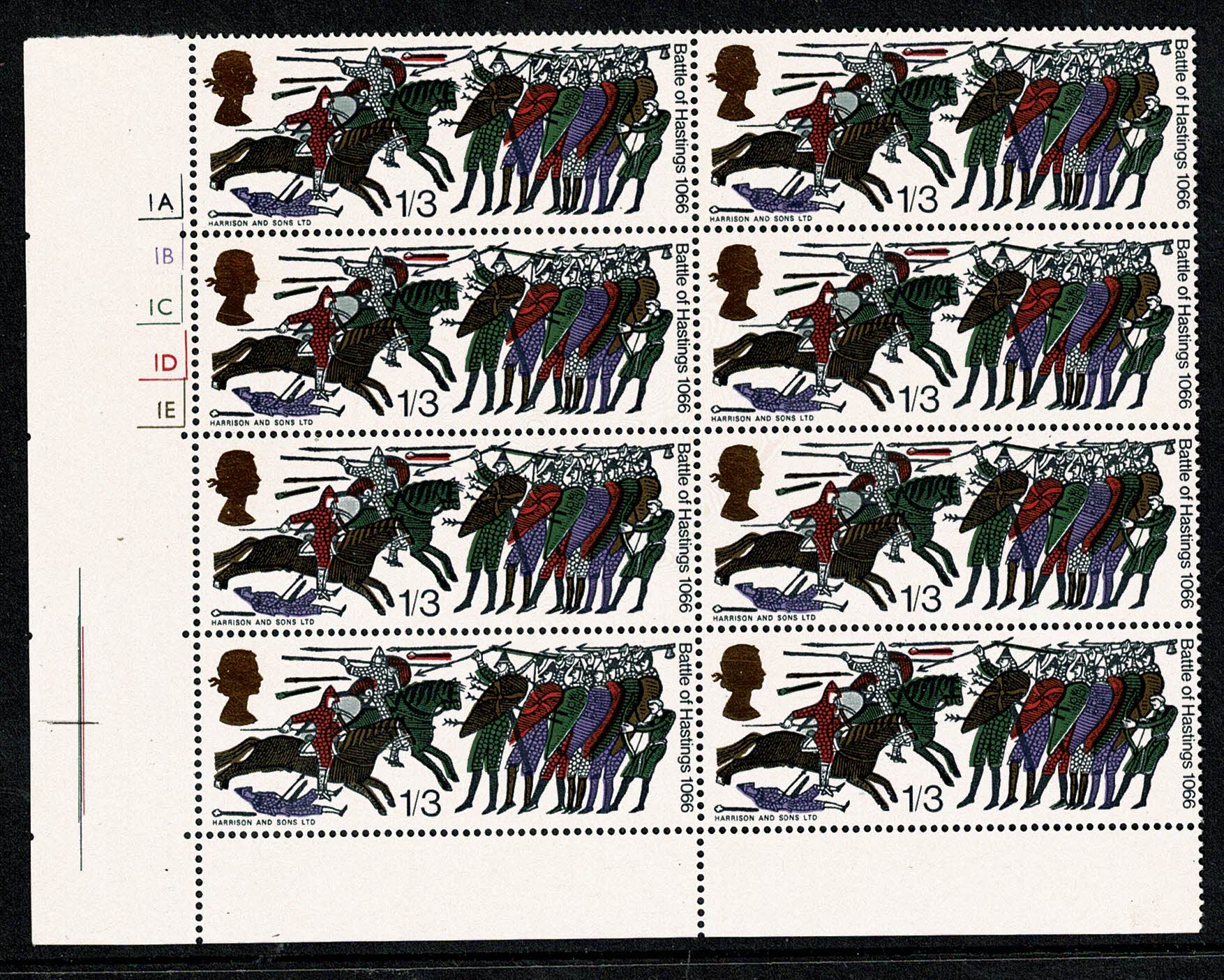 1966 Battle of Hastings 1/3 (ord). Cylinder 1A 1B 1C 1D 1E no dot block of eight with listed variety.SG 712