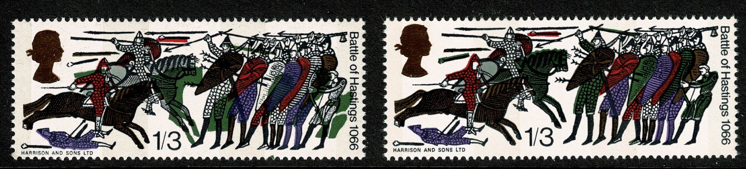 Unmounted mint single with large SHIFT OF BRONZE GREEN colour downwards to right. Results in colour lost from clothing of standing knight at left and archer at right and very visual effect on horse at right. Illustrated and supplied with matching normal pair. As illustrated.