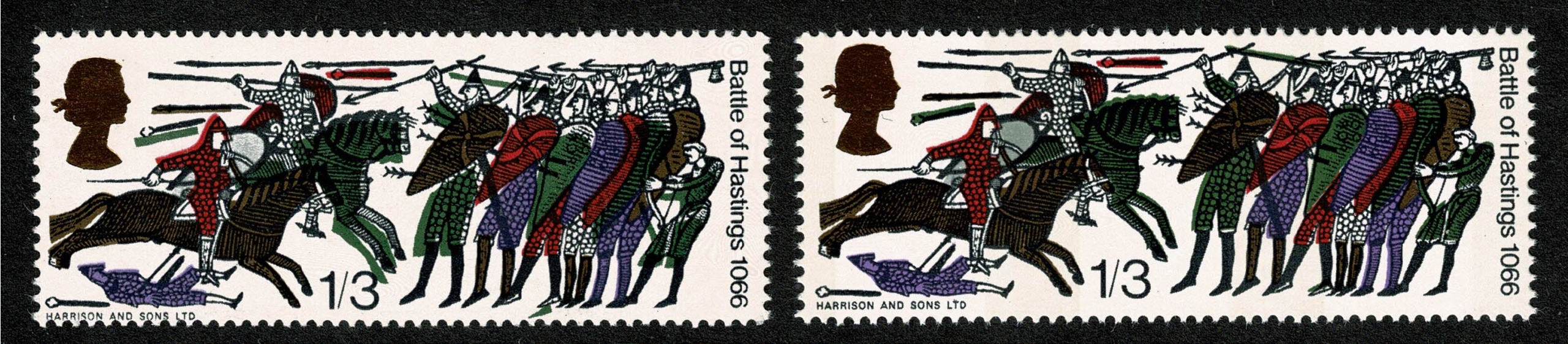 Unmounted mint single with SHIFT OF BRONZE GREEN downwards to left. Affects clothing of standing knight at left and archer at right and central shield plus effect on horse at right. Illustrated and supplied with matching normal pair. As illustrated.