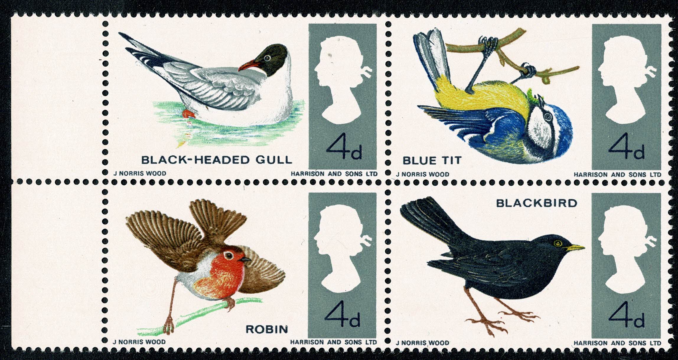 Unmounted mint marginal block of four. Listed minor constant varieties "small black dot on gull's wing" R 5/1 and "red dot between blackbird's claws R 6/2