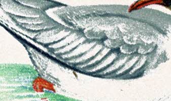 nmounted mint marginal block of four. Listed minor constant varieties "small black dot on gull's wing" R 5/1 and "red dot between blackbird's claws R 6/2