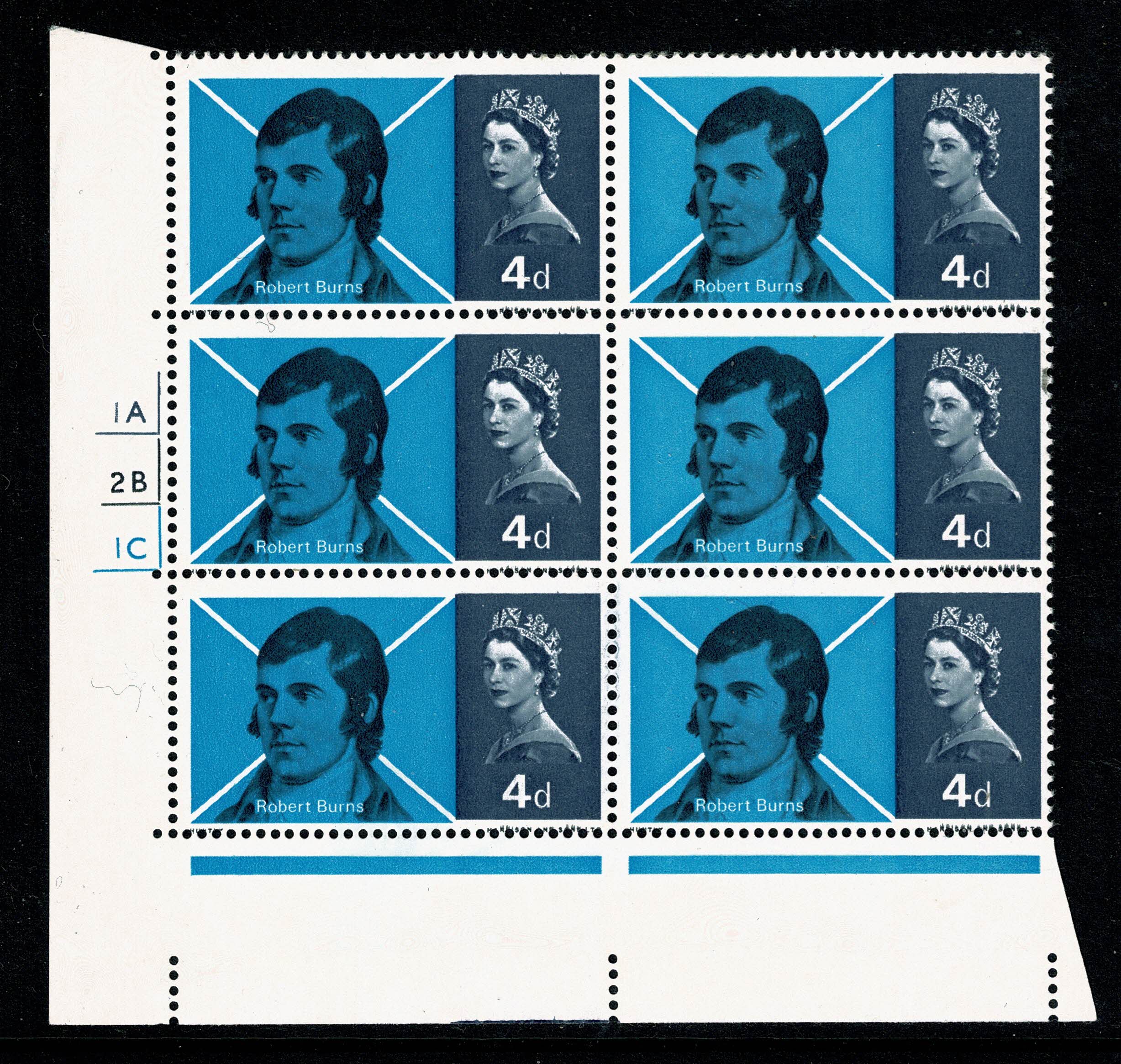 1966 Burns 4d (ord). Cyl. 1A 1B 1C no dot block of six. SG 685