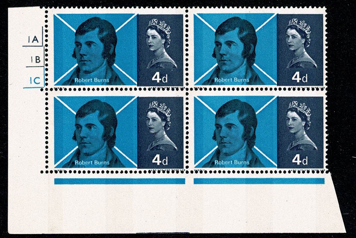 1966 Burns 4d (phos). Cyl. 1A 1B 1C no dot block of 4. Perf. Type A (E/I)