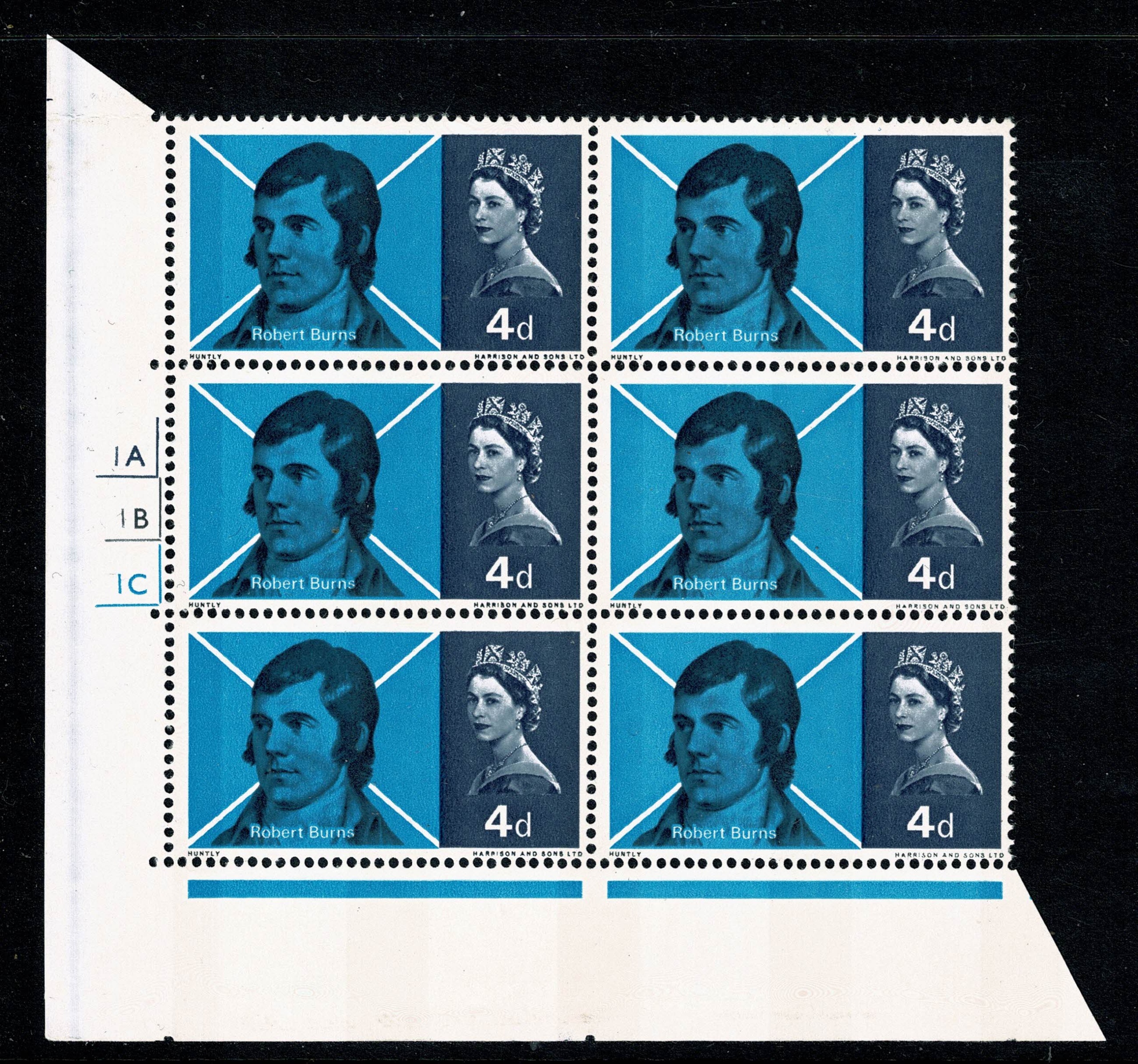 1966 Burns 4d (phos). Cyl. 1A 1B 1C no dot block of six. SG 685p