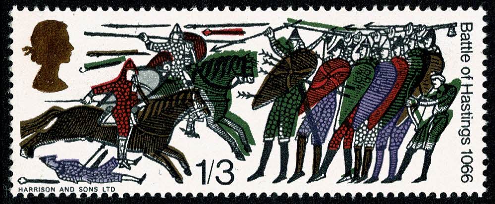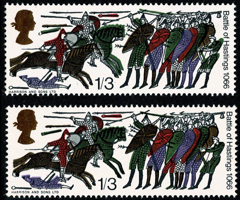 Unmounted mint single with crease top right corner. UPWARD SHIFT OF OLIVE GREEN. Most noticeable in tunic of figure at right. Illustrated and supplied with normal below.