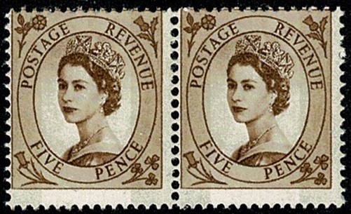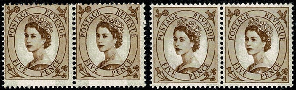 1967 5d brown 2B Wmk Multiple Crowns . PERFORATION SHIFT pair. SG 616c var
