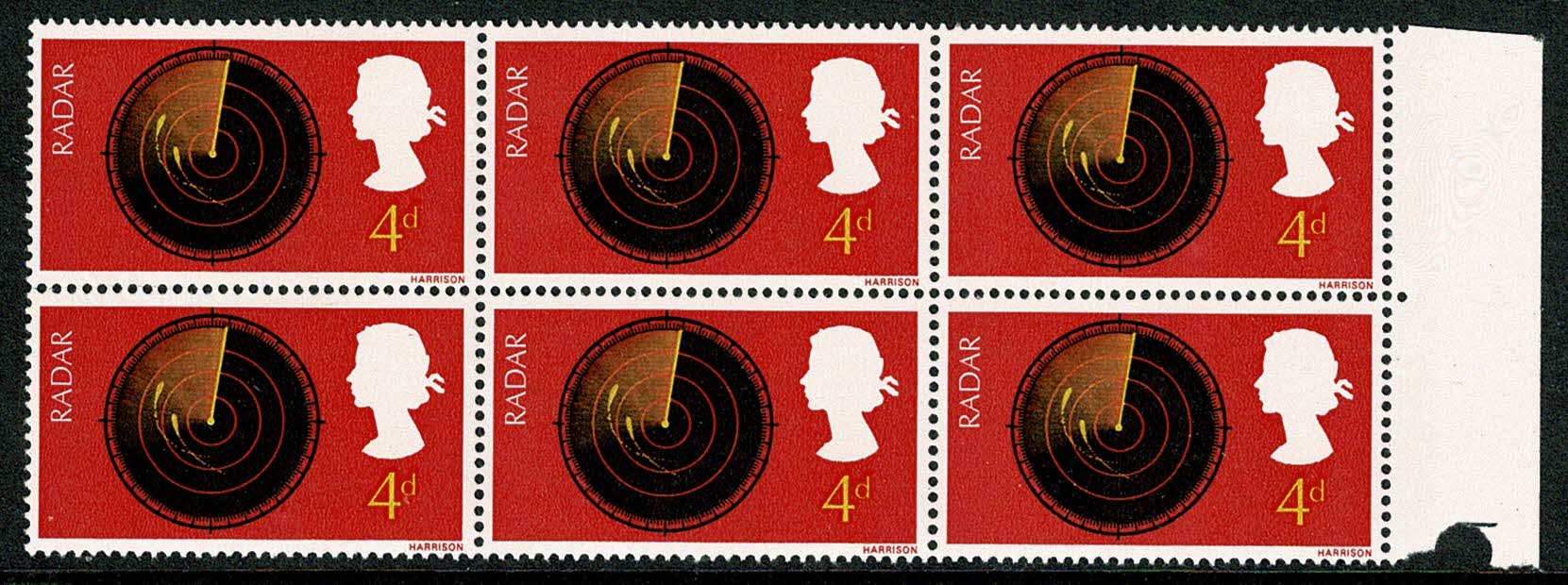 Unmounted mint marginal block of six with "break in scale division of radar screen in centre left mark" from R 14/5. Middle stamp lower row of block.