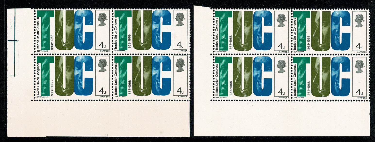 Unmounted mint corner block of four with small SHIFT OF BLUE to left. Results in small overlap of blue C and olive U. Illustrated and supplied with normal block at right.