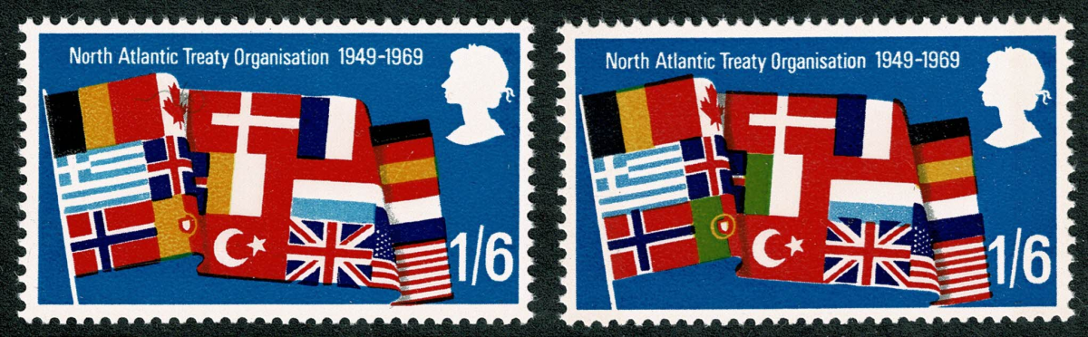 Unmounted mint single with MISSING YELLOW-GREEN (Italian and Portuguese flags) and MISSING PHOSPHOR. Illustrated with normal at right.