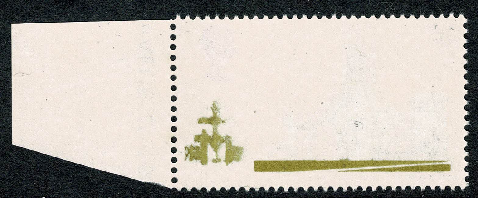 UM single with OFFSET of yellow olive colour on gummed side. Illustrated and supplied with normal at right.
