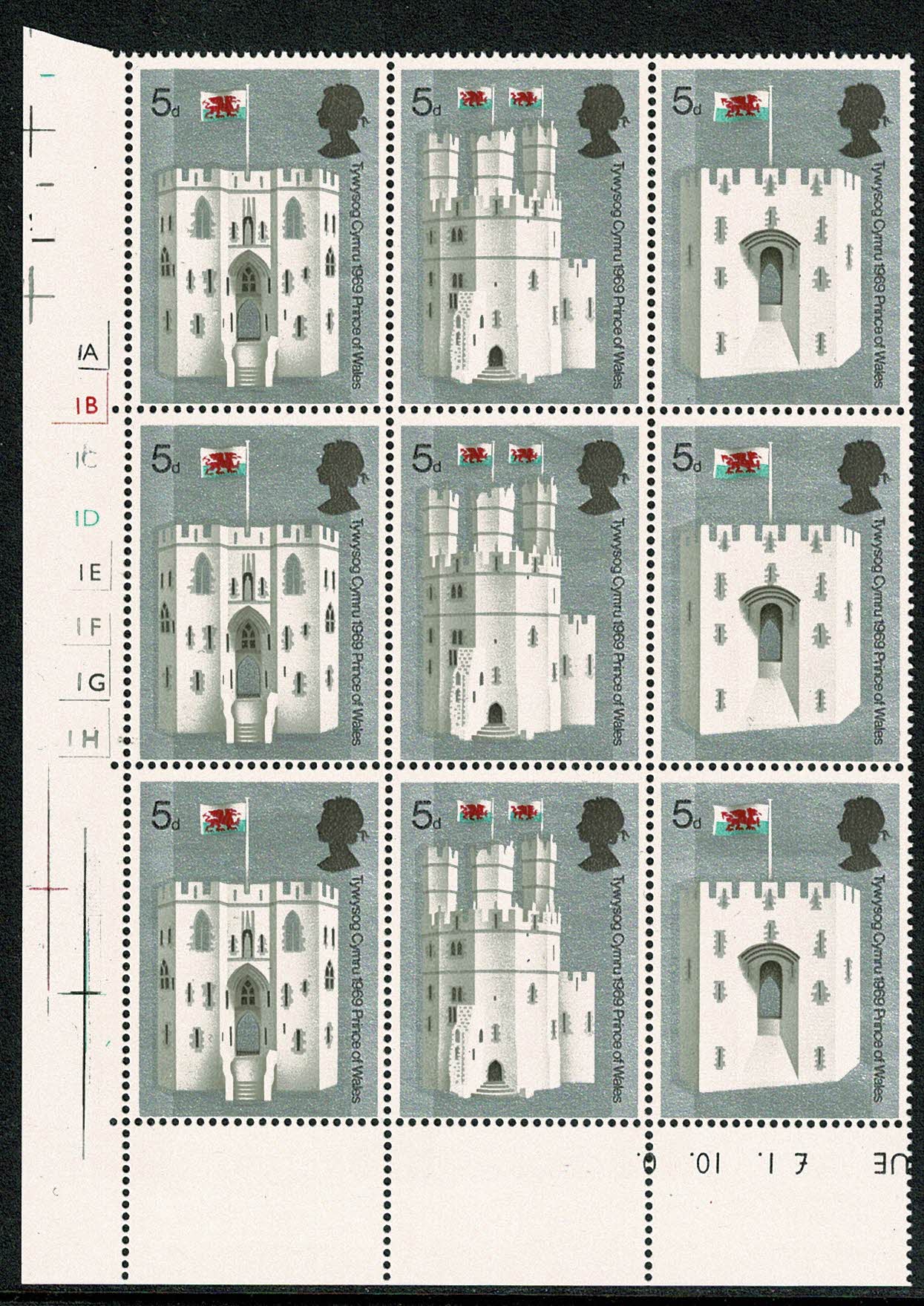 1969 Investiture 5d. Cyl. 1A 1B 1C 1D 1E 1F 1G 1H no dot. block of nine