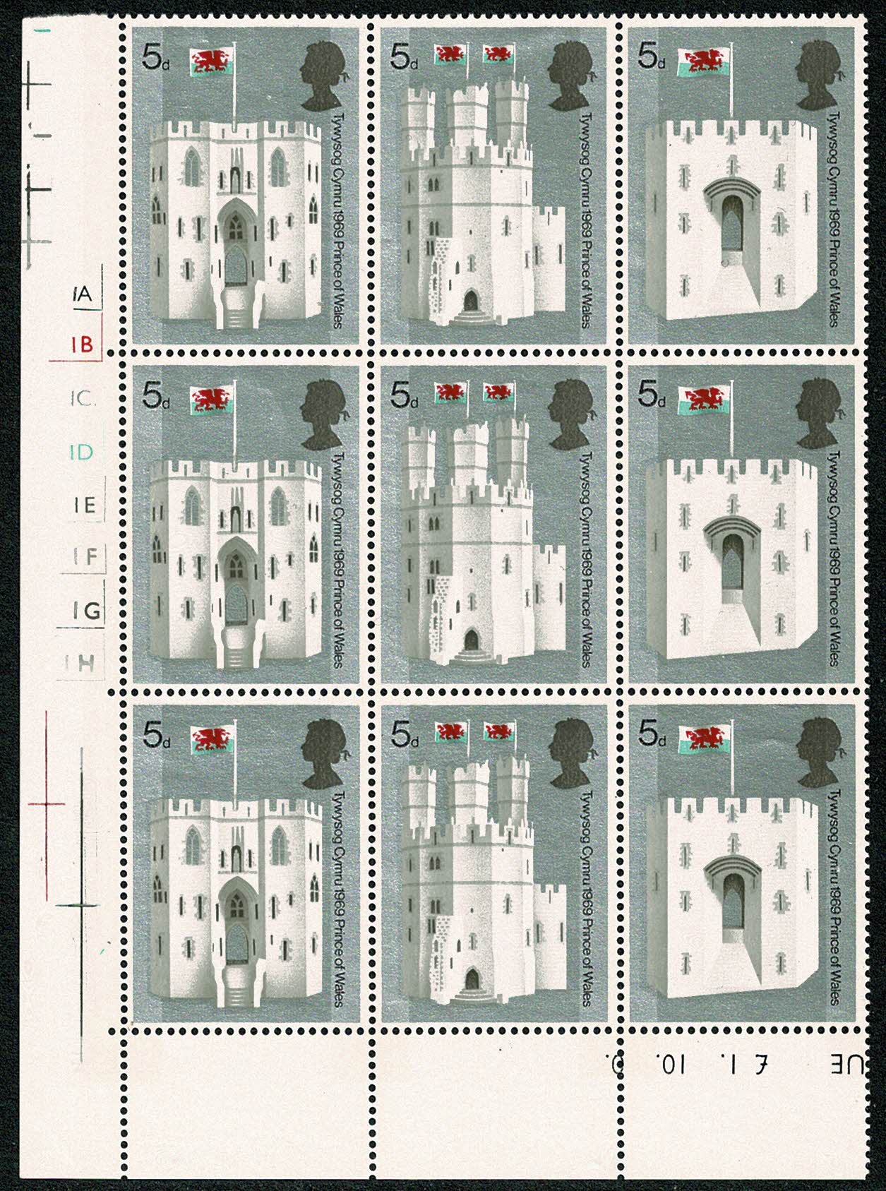 1969 Investiture 5d. Cyl. 1A 1B 1C 1D 1E 1F 1G 1H no dot. block of nine