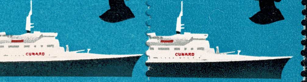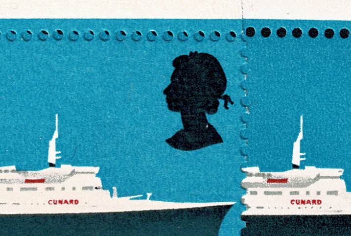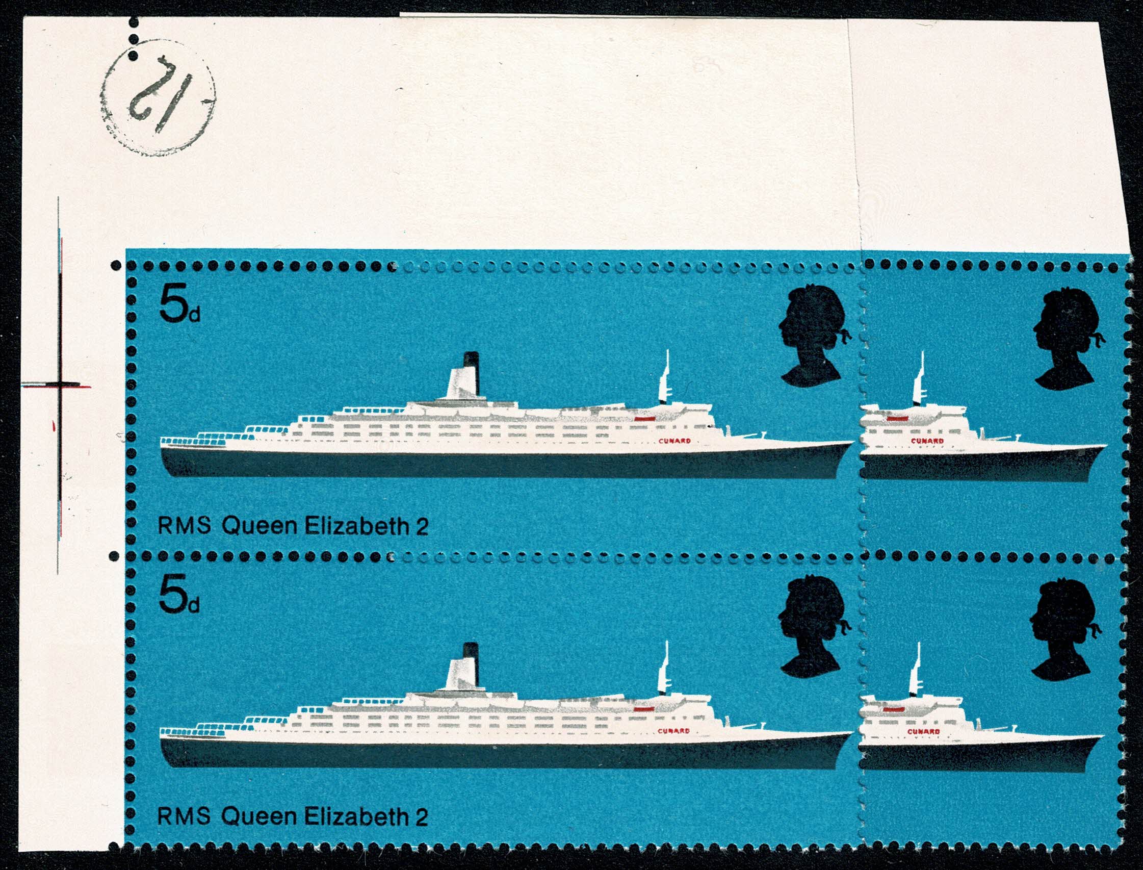 1969 Ships 5d with SHIFT OF RED DOWNWARDS (Cunard logo). Attractive positional pair. Illustrated and supplied with normal pair. Image close ups at each level with normal pair alongside at right.