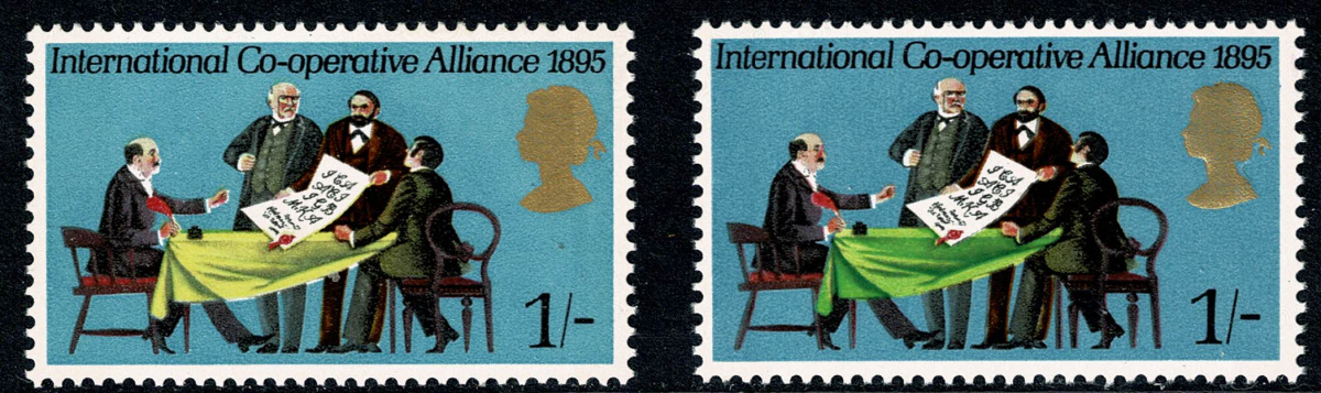 Unmounted mint single with MISSING GREEN (table cloth) and MISSING EMBOSSING. Illustrated with normal at right.
