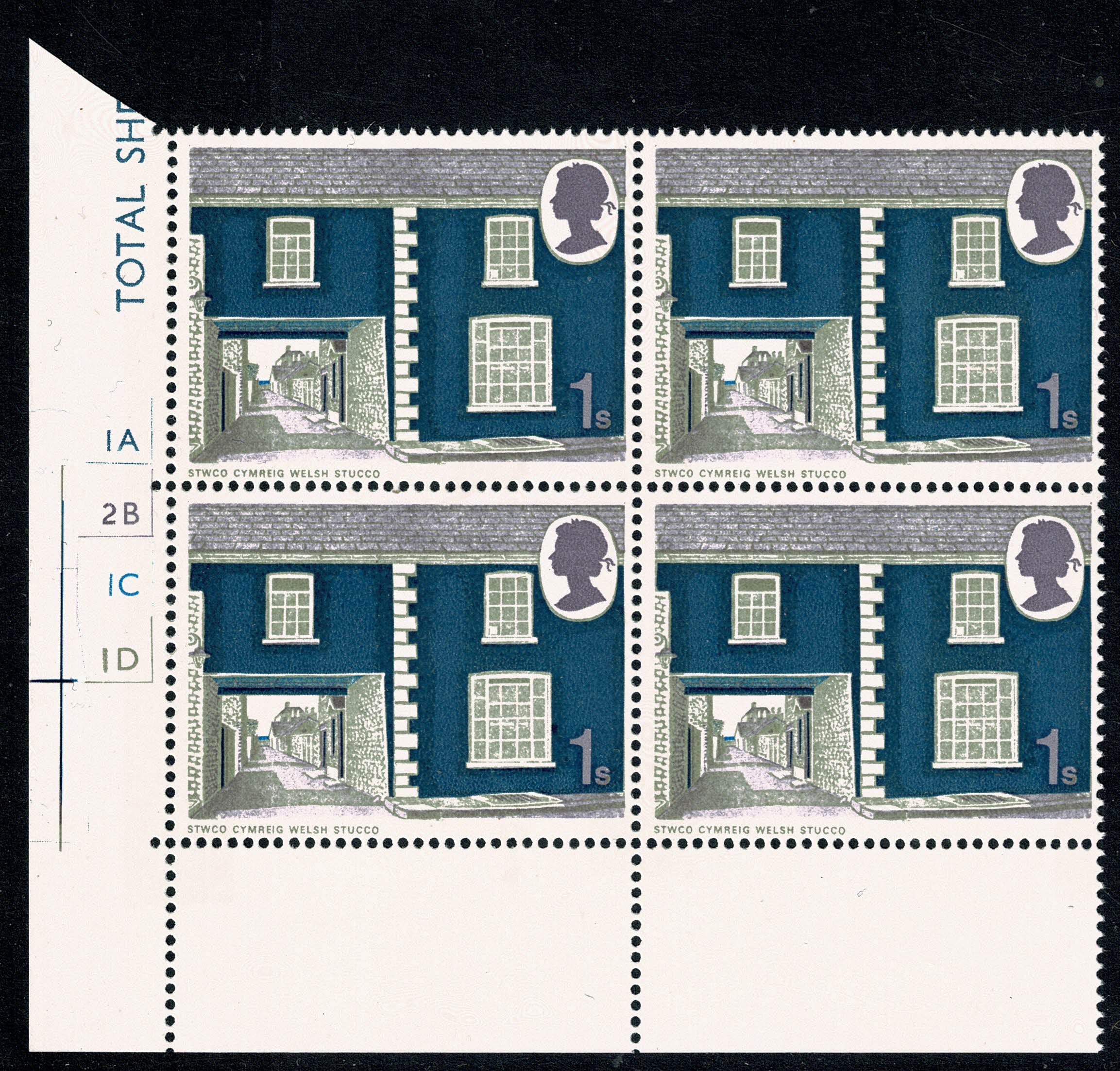 1970 Cottages 1/- Cylinder 1A 2B 1C 1D no dot block of four. SG 713p