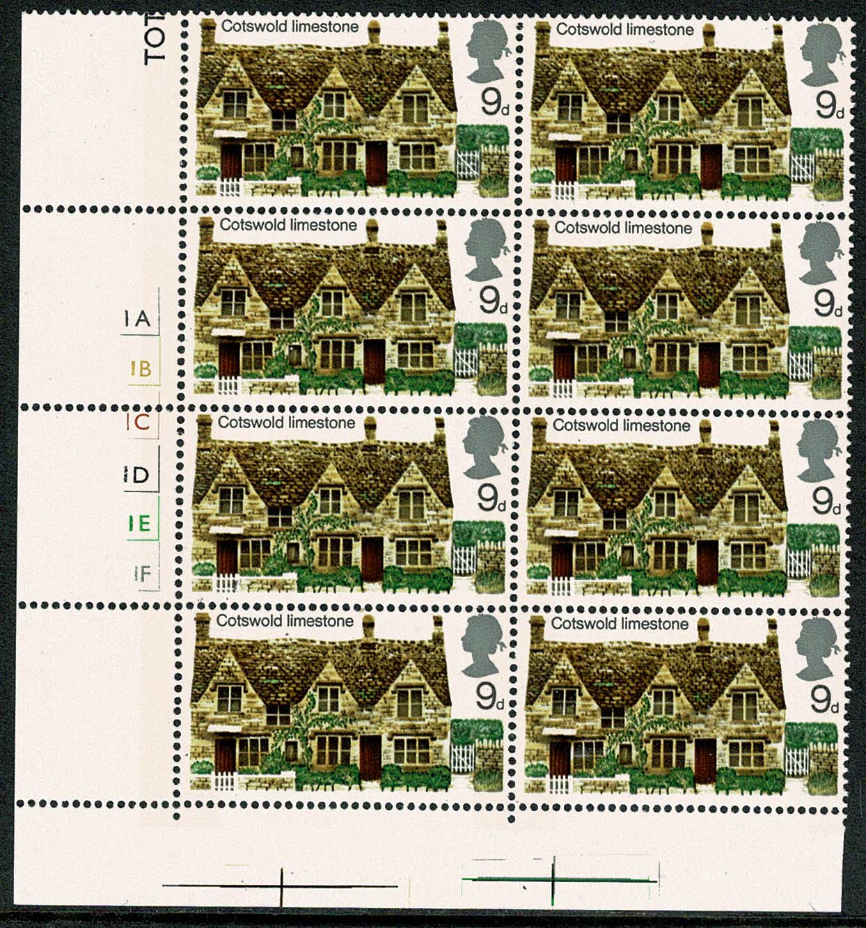 1970 Cottages 9d Cyl. 1A 1B 1C 1D 1E 1F no dot. Block of Eight.