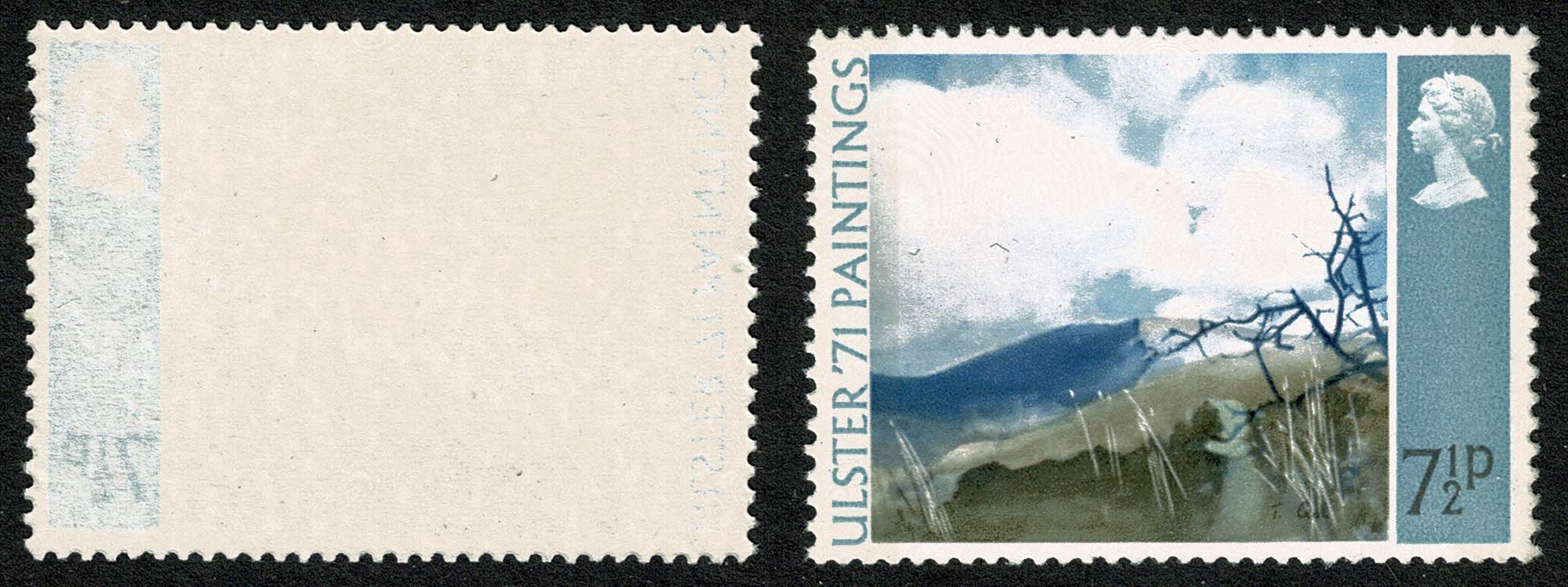 1971 "Ulster" paintings 7½p. OFFSET of grey blue. SG 882 var