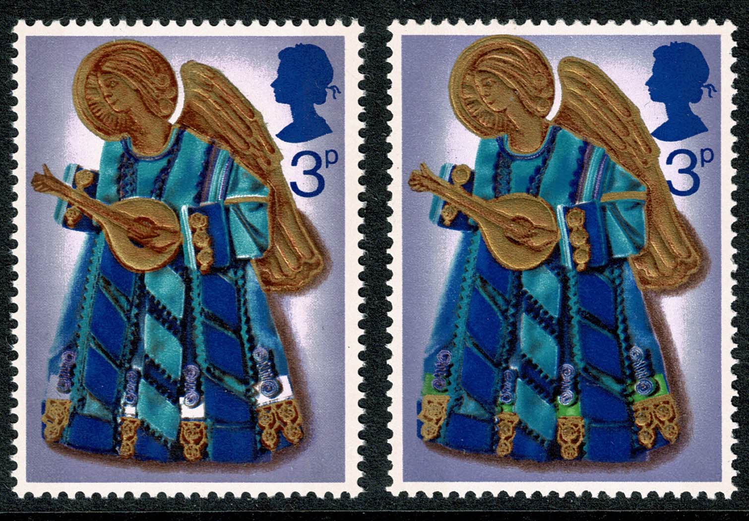 Fine unmounted mint 1972 Christmas 3p. MISSING BRIGHT GREEN. SG 914b. Illustrated and supplied with normal at right