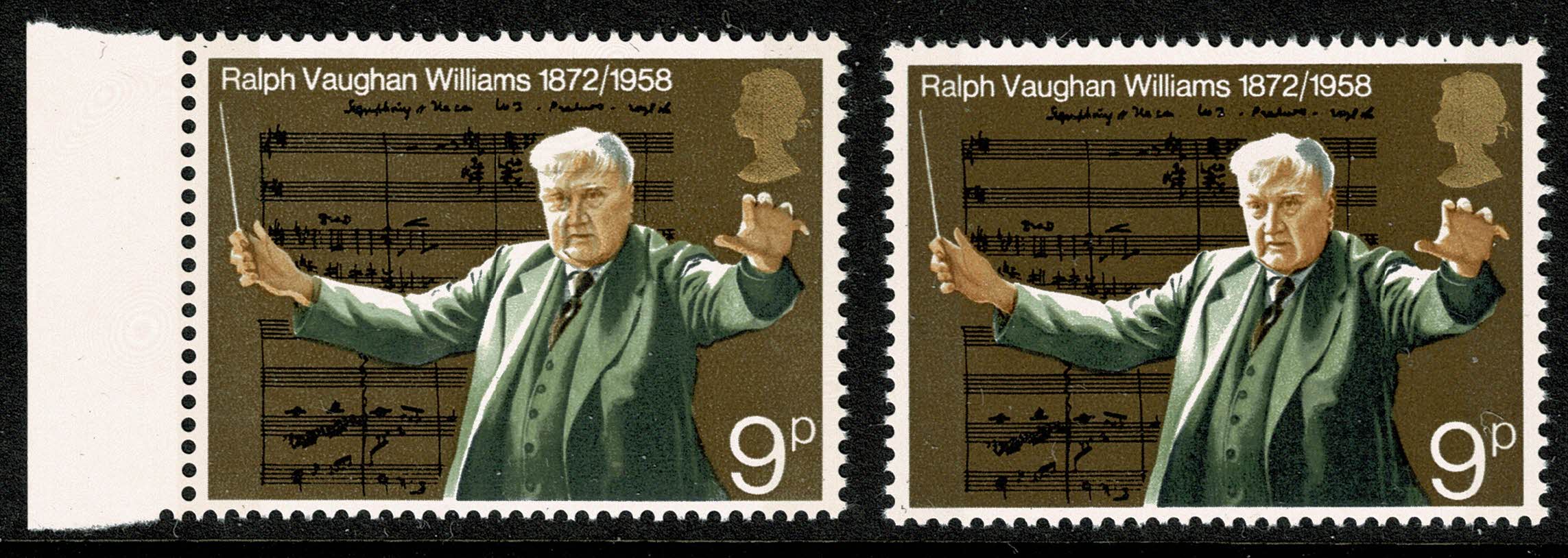Unmounted mint marginal single with small shift of bistre brown colour to right resulting in distortion of facial features. Illustrated and supplied with normal at right.