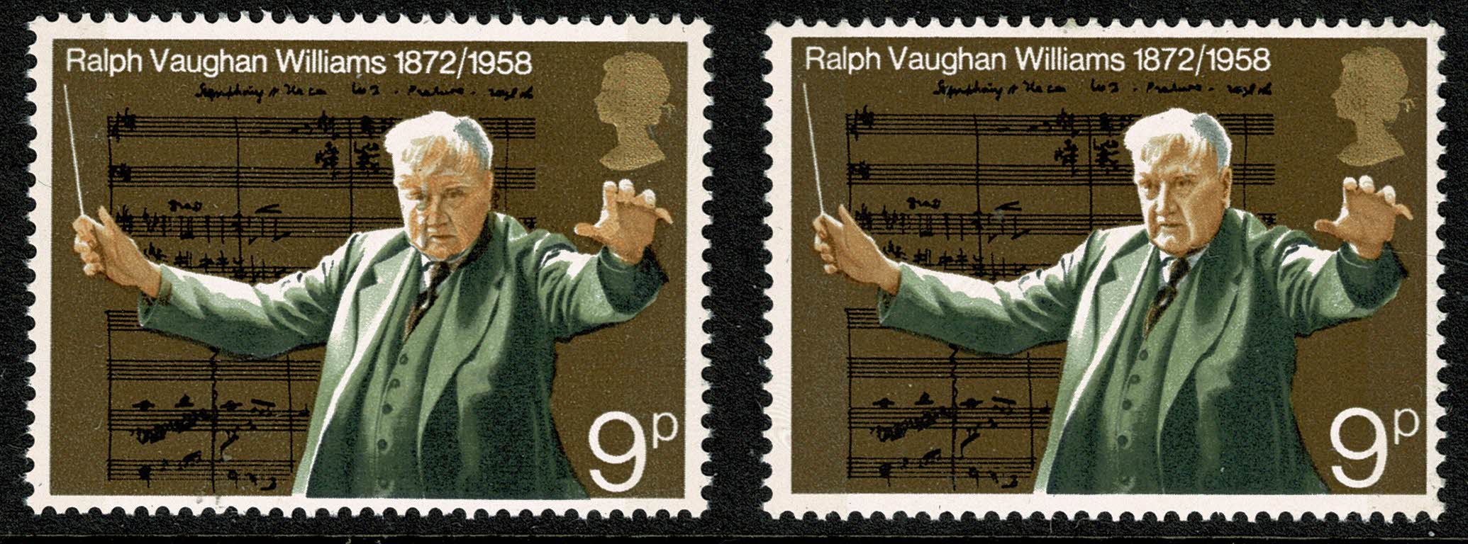 Unmounted mint marginal single with small shift of bistre brown colour to right resulting in distortion of facial features. Illustrated and supplied with normal at right.
