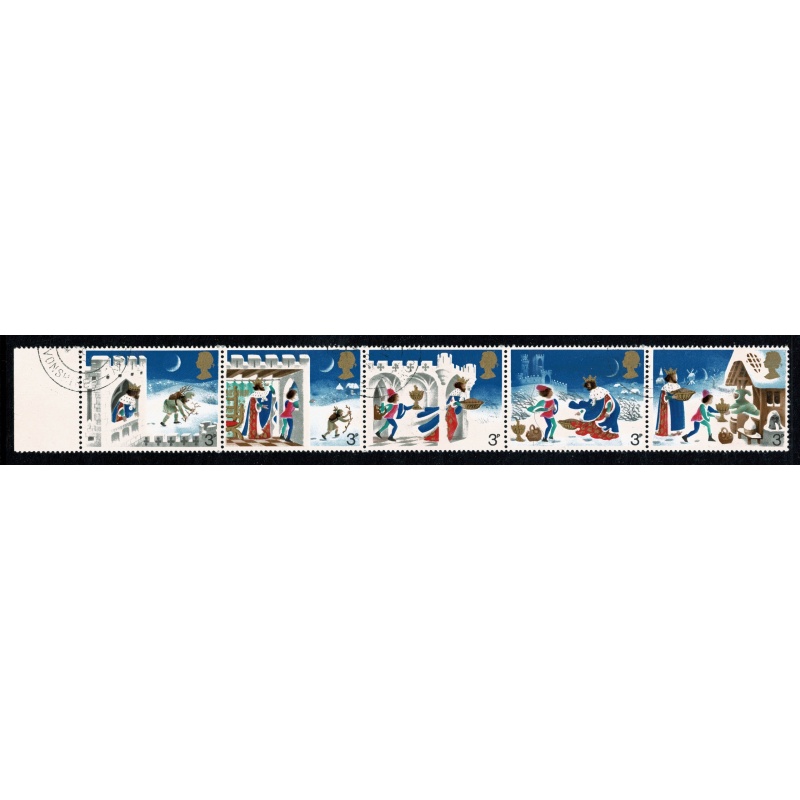 1973 Christmas 3p DRY PRINT OF SALMON PINK. Fine used strip of 5 values. SG 943-947