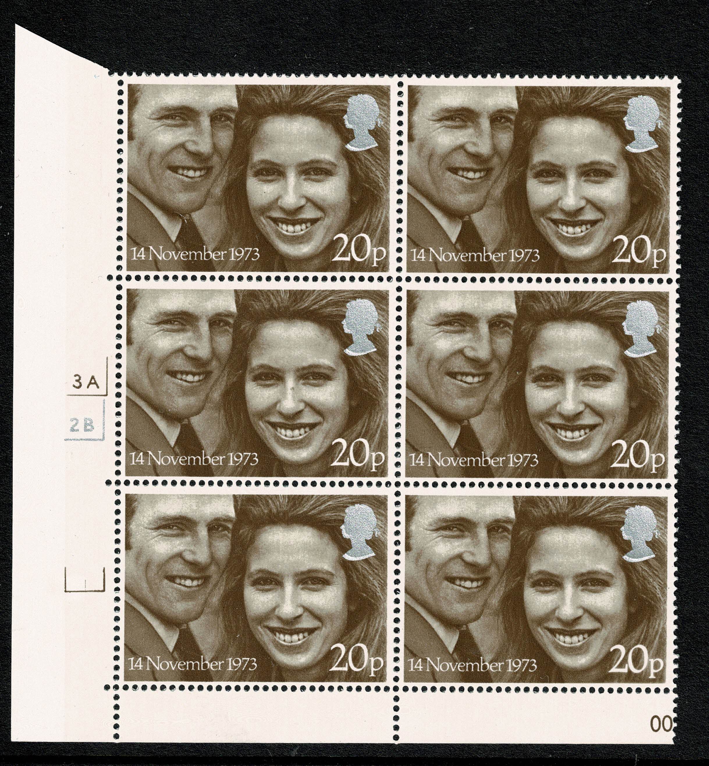 Unmounted Mint. 1973 Royal Wedding 20p. Cylinder 3A 2B p50 no dot block of six. As illustrated