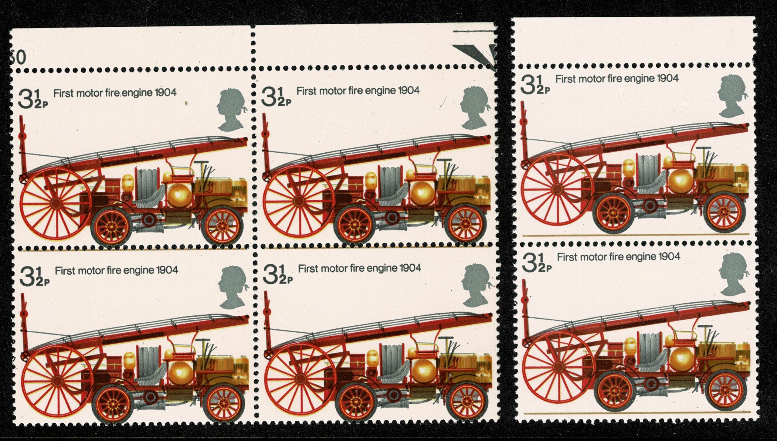 1974 Fire Service. Unmounted Mint upper marginal block of four with small upward shift of horizontal perforations. As illustrated. Supplied with normal pair at right.
