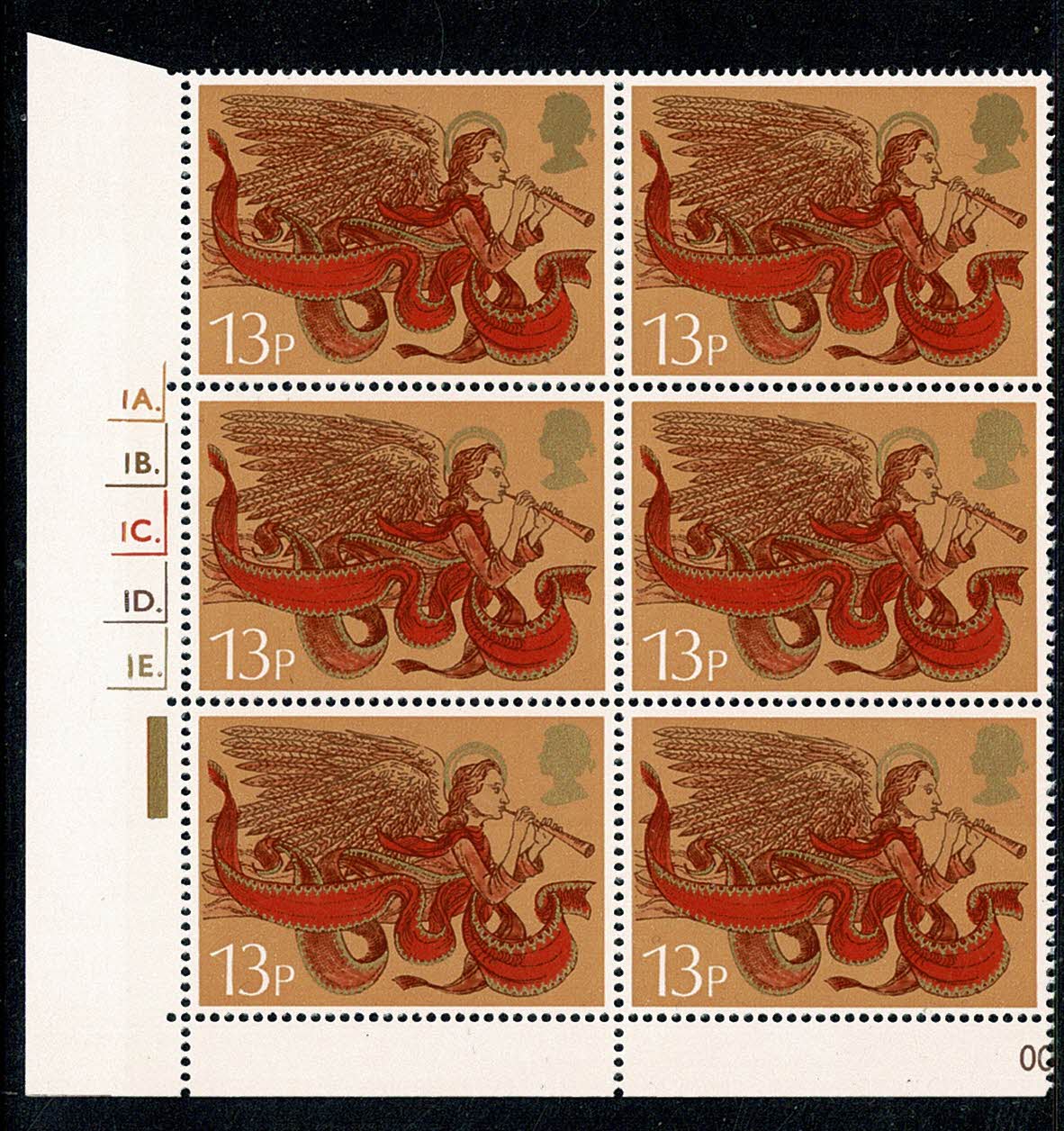 1975 Christmas 13p. Cyl. 1A 1B 1C 1D 1E no phos dot block of six. SG 996