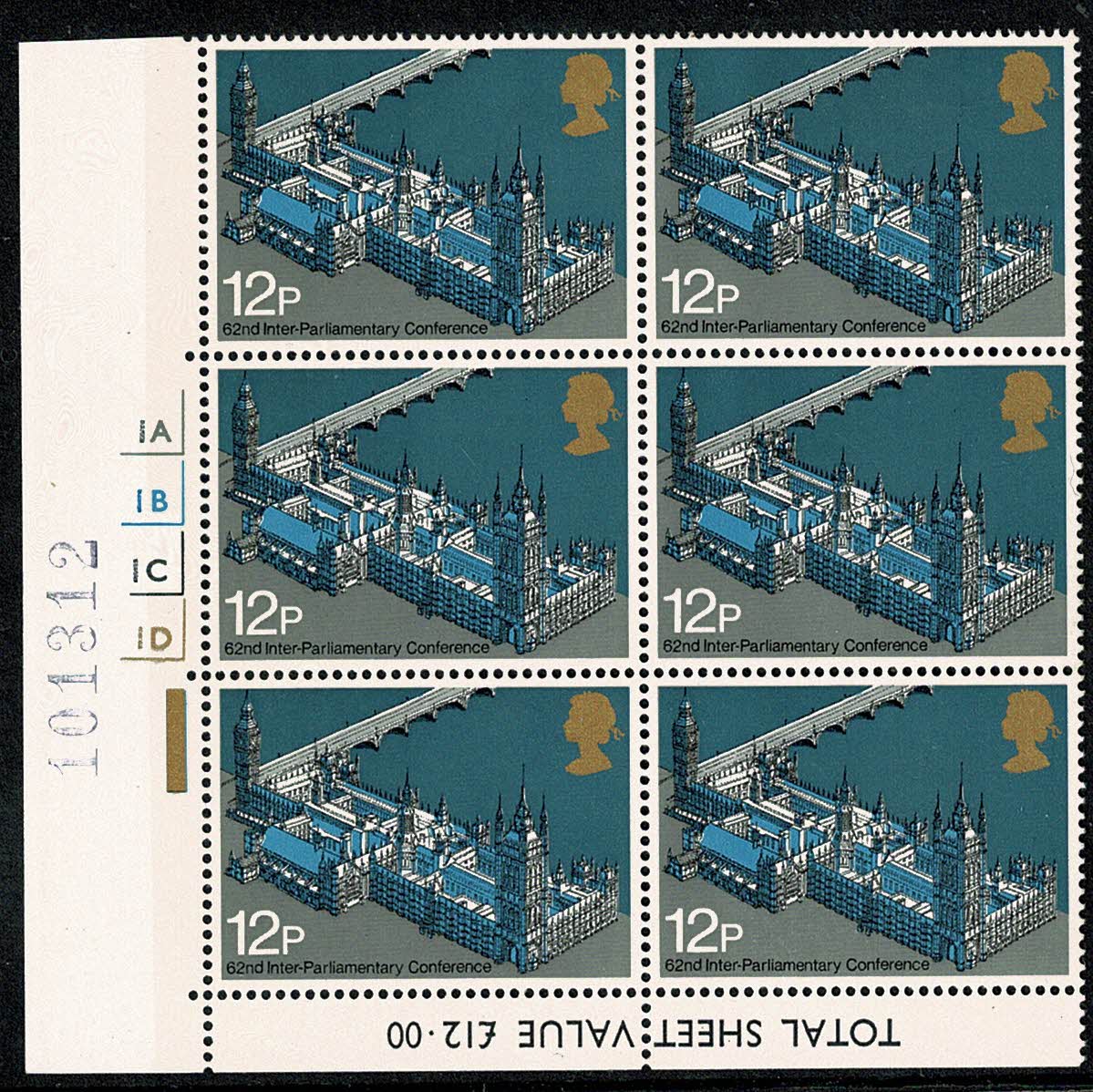 1975 Parliament 12p Cyl. 1A 1B 1C 1D p61 no dot block of six. SG 988